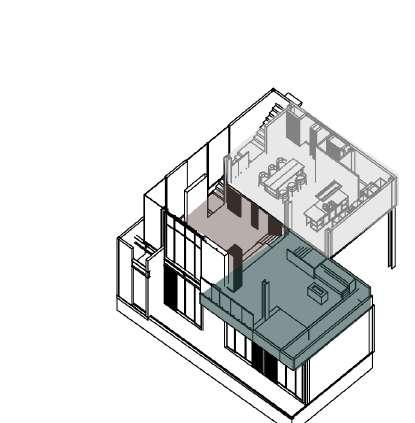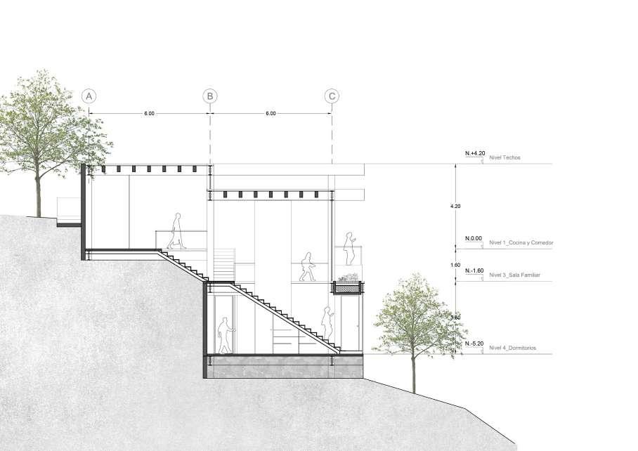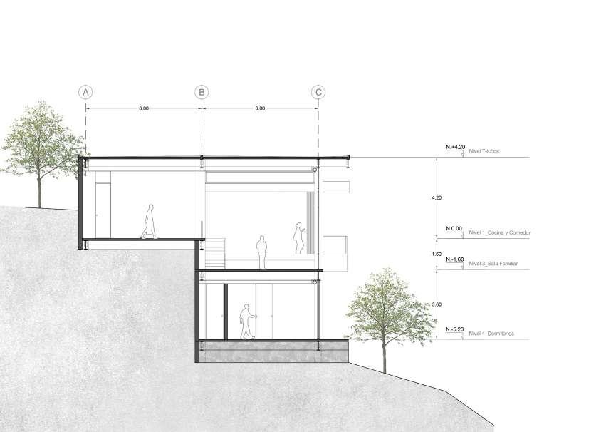 El ambiente de la cocina y comedor se encuentra a una altura, el ambiente exterior del firepit y jacuzzi 0.8 m más abajo , y la sala principal de igual manera. 0.8 m más abajo. Esto también permite crear espacios de distintas alturas. En la sala principal se crea un área de doble altura. Y maximizar las vistas hacía el