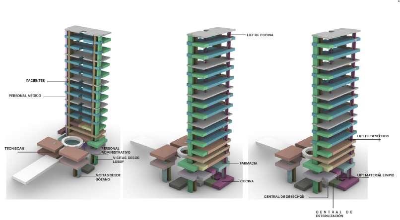 Es psoibles visualizar esto en los diagramas de circulación de los niveles de quirofano ya que estas son las áreas en donde se encuentran la mayor cantidad de flujos, tanto de personas como de suministros, material y desechos. Este fue el mayor reto del proyecto.