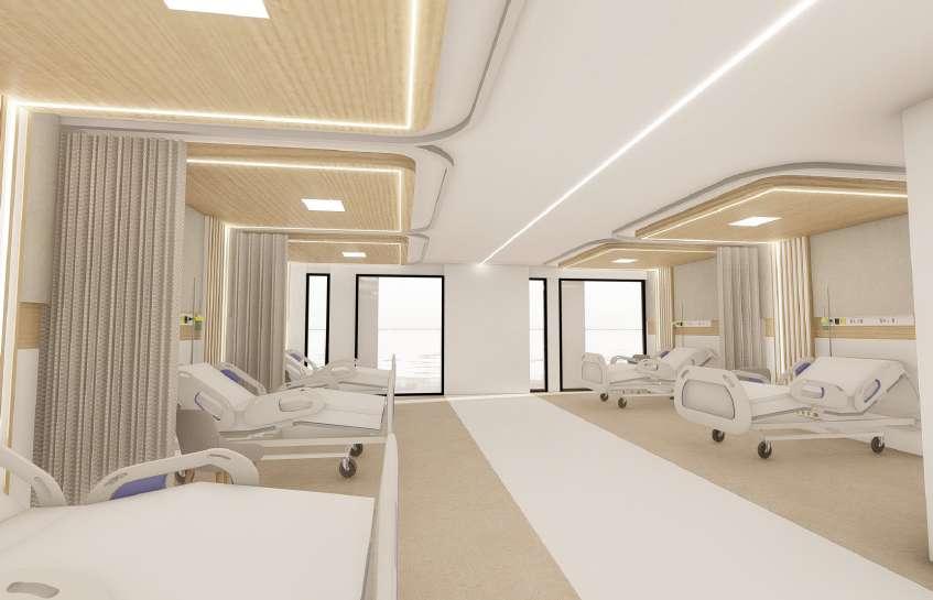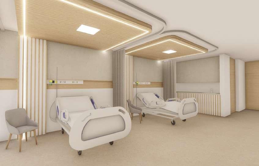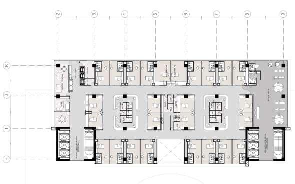Para el diseño de los niveles de encamamiento se propusieron materiales que generaron un diseño limpio y que transmitiera tranquilidad. Con el objetivo de lograr áreas de espera con vegetación se crearon esta serie de terrazas en los niveles de encamemiento normal de doble altura hacia los niveles del ICU, ya que en estos niveles las visitas son casi nulas.