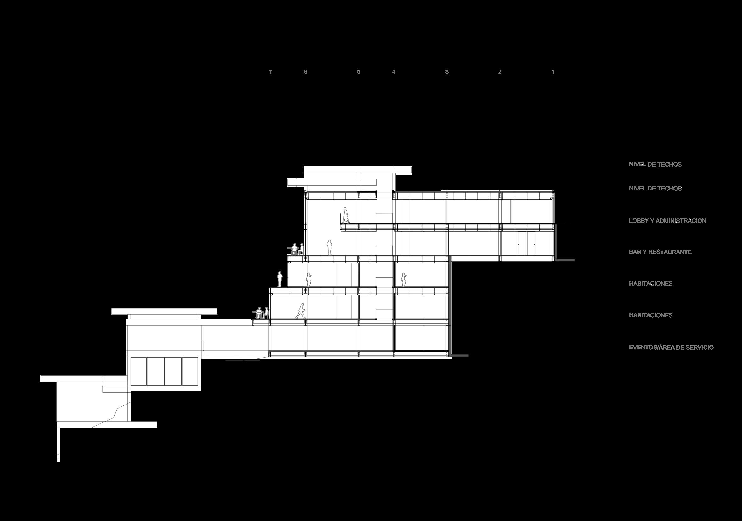 En la primera planta se cuenta con la recepción y área administrativa, en la segunda con el BOH, restaurante y bar y en la tercera y cuarta con las habitaciones del hotel. En la quinta planta se genera un espacio de eventos que se expande a las terrazas de eventos que se encuentran sobre el gimnasio y el spa.