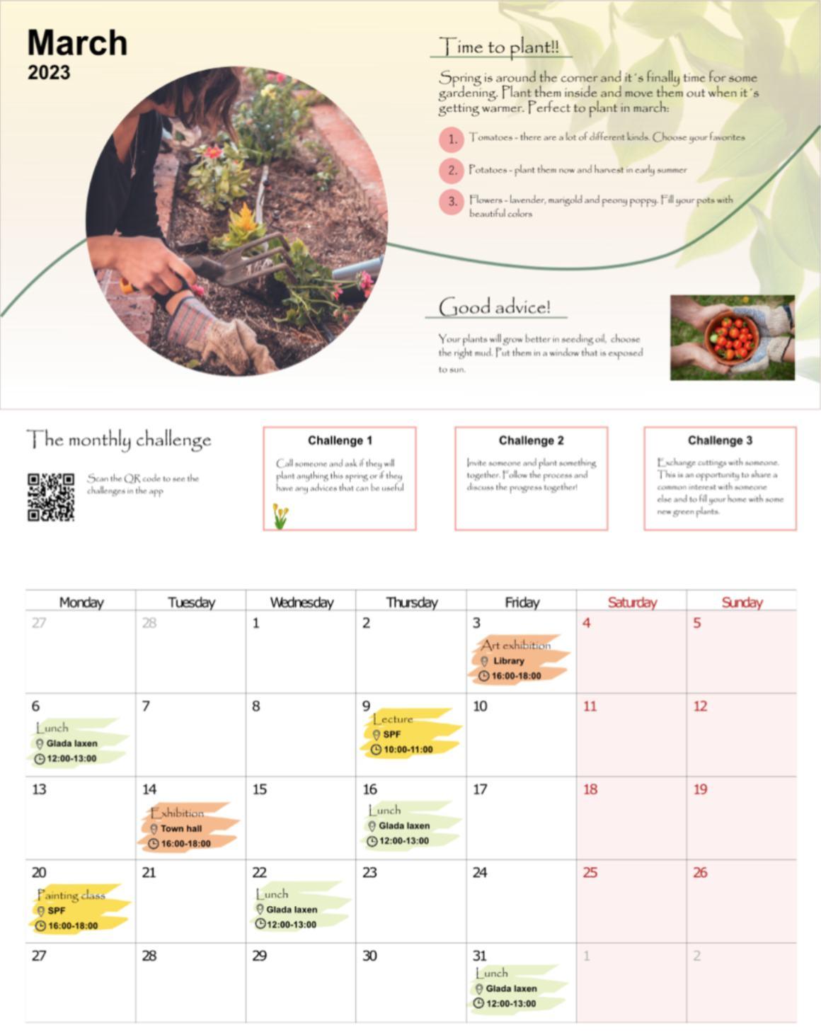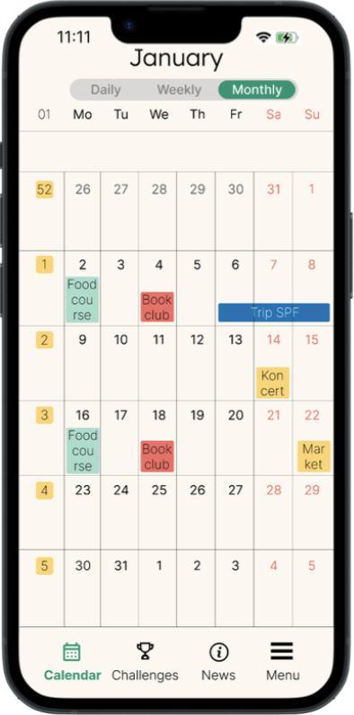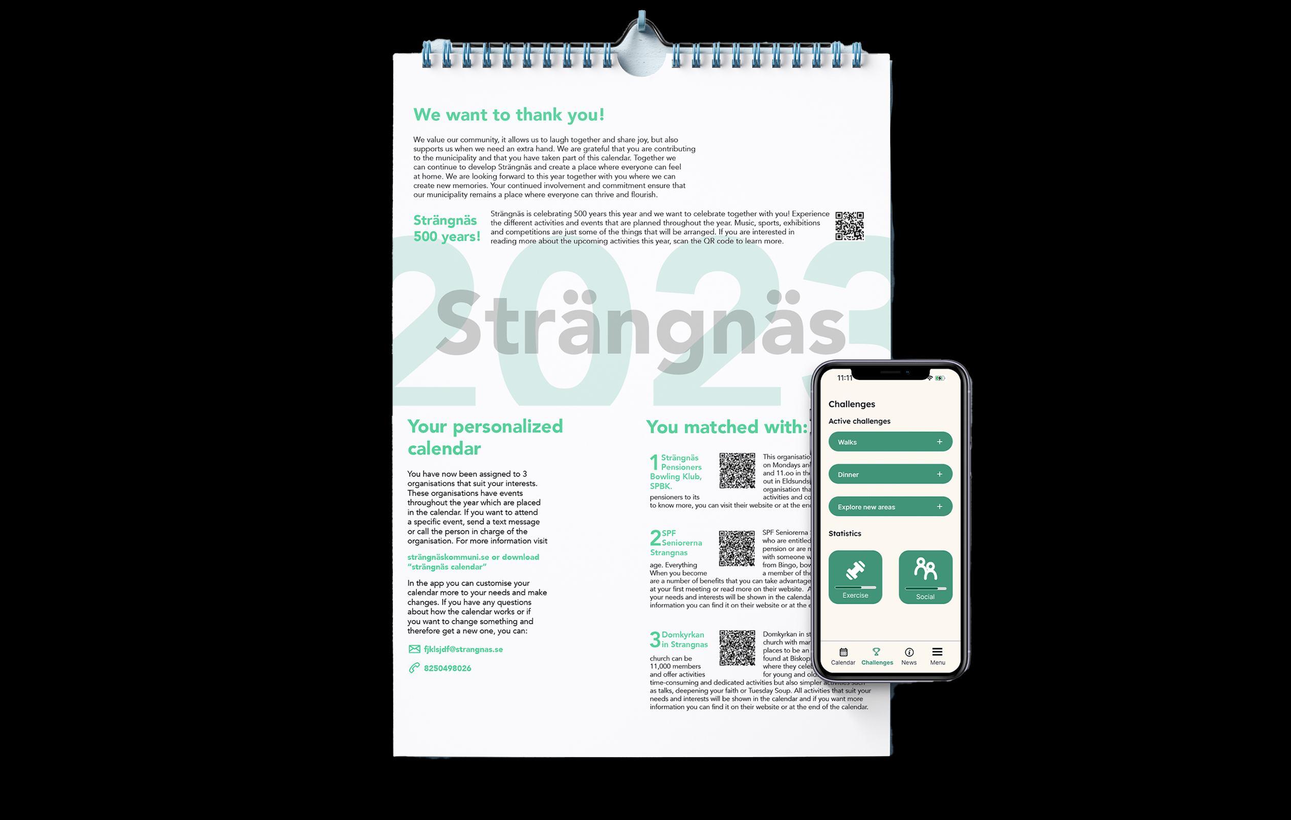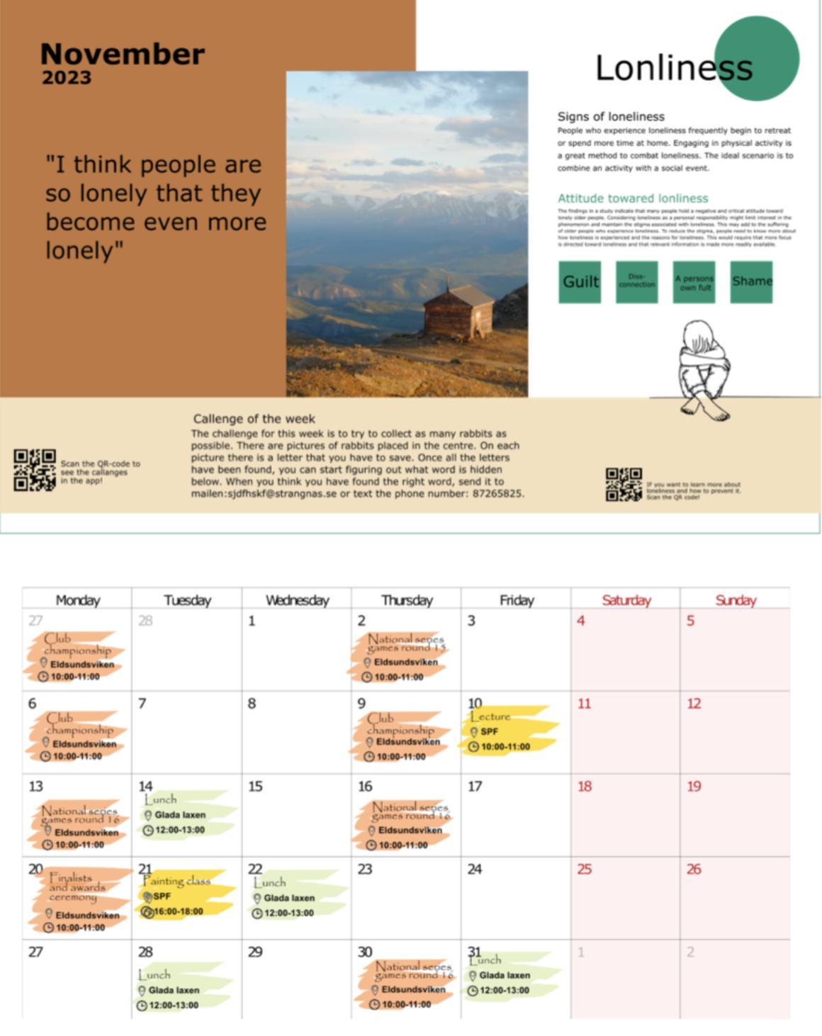 An app and a physical calendar that offer elderly-friendly activities, organized by various organizations in Strängnäs. The app is also a communication channel between the users, and user-organization. The physical calendar complements the app and is intended for the technologically inexperienced.