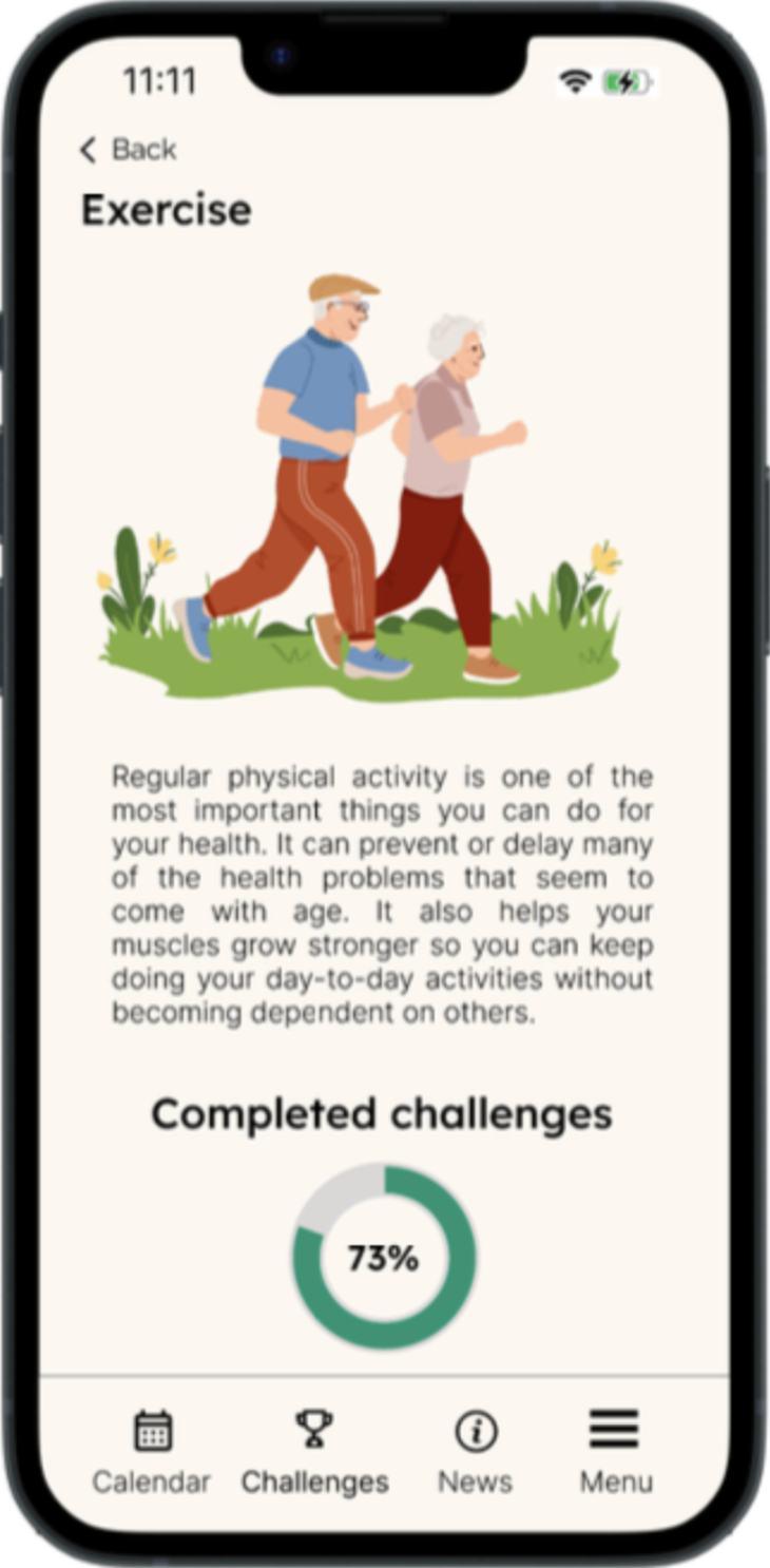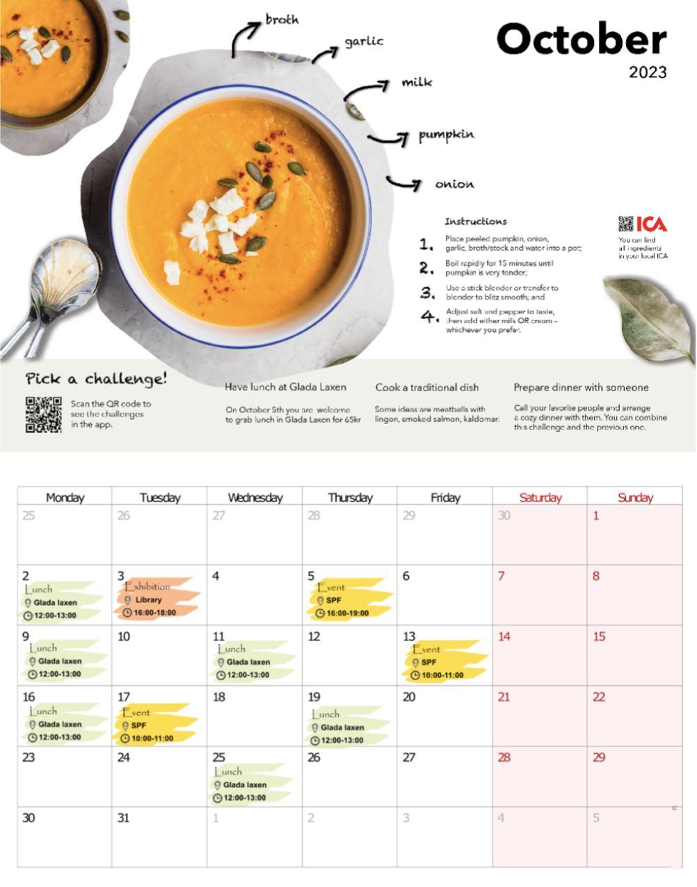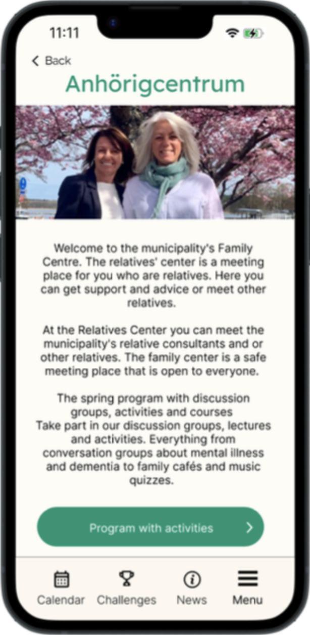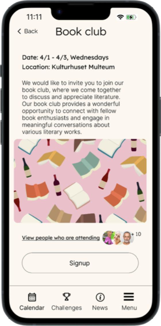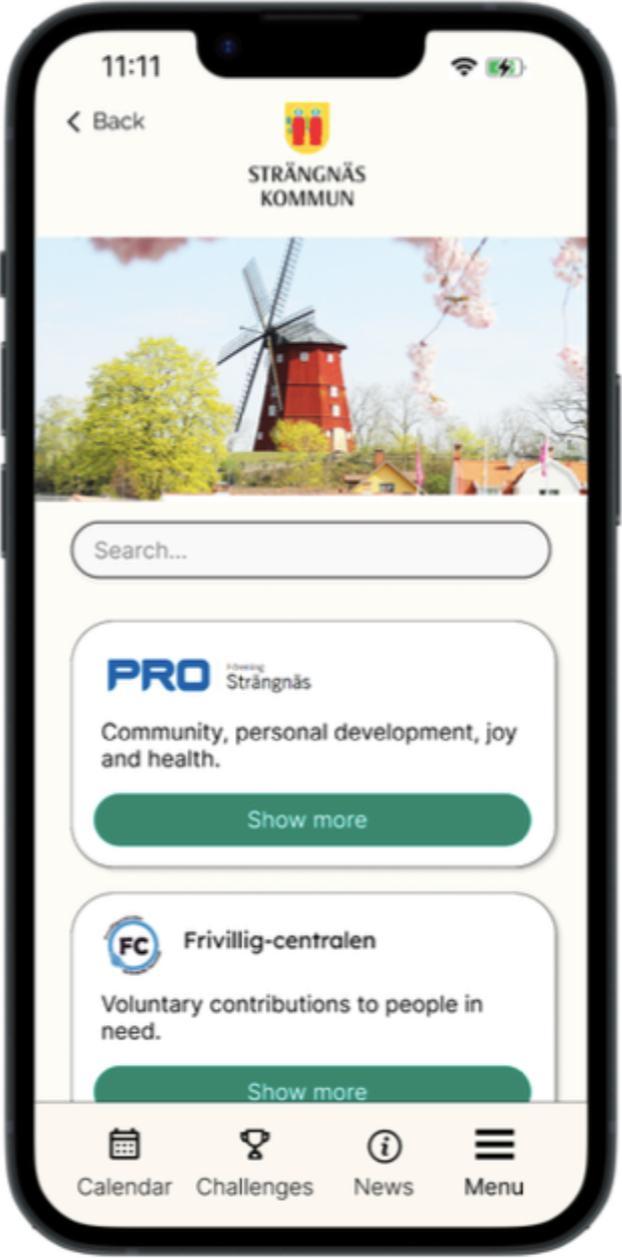 An app and a physical calendar that offer elderly-friendly activities, organized by various organizations in Strängnäs. The app is also a communication channel between the users, and user-organization. The physical calendar complements the app and is intended for the technologically inexperienced.
