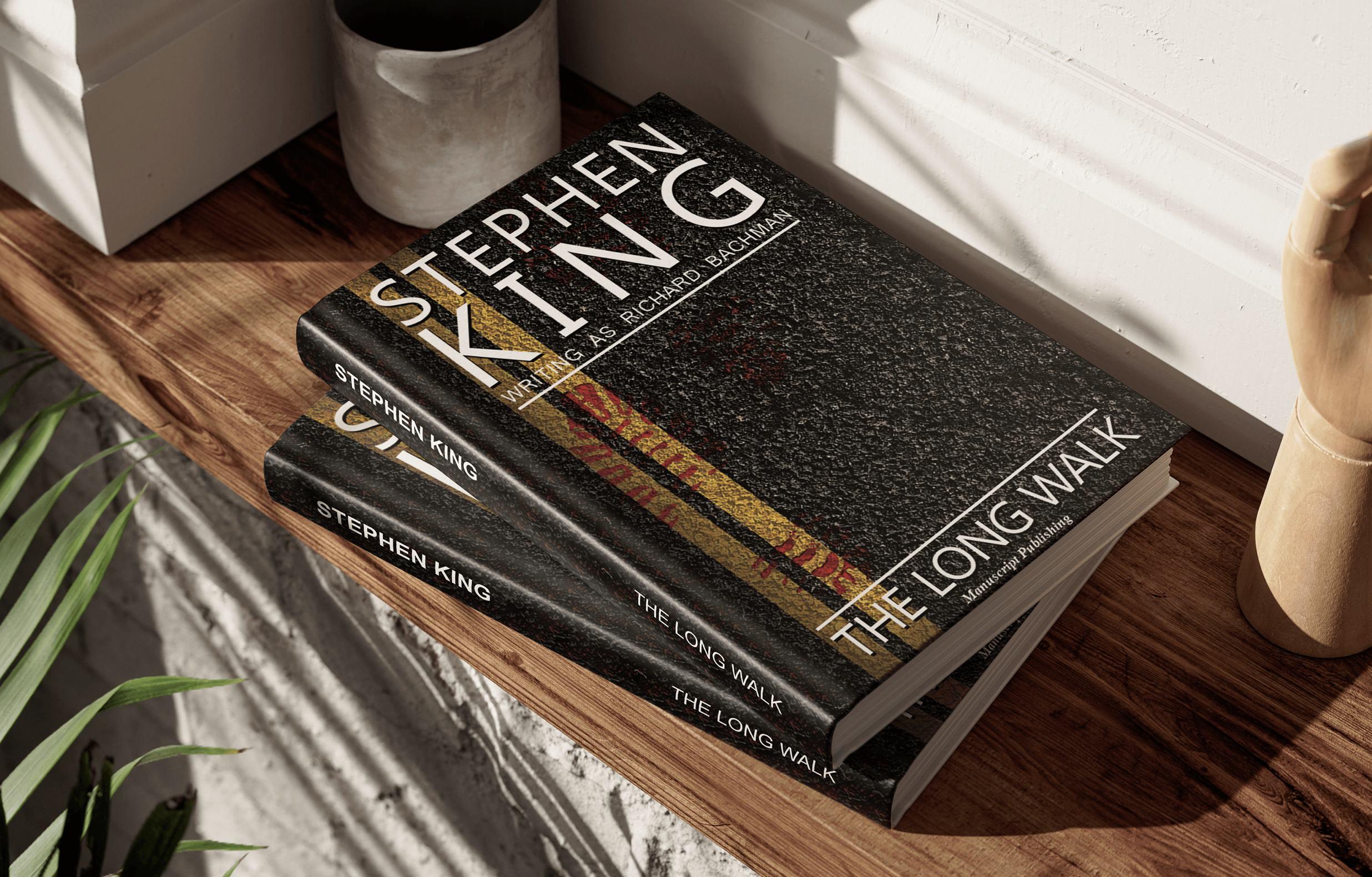 n 'The Long Walk' the cover is a symbol of a recurring motif which embodies the harrowing journey where stopping means certain death. The design blends visuals and typeface and adds to the mystery. The story itself is about walking until you can’t anymore which leads to being shot by military. The fate of the 100 boys on this journey to certain death, where only one would survive lies behind the bloody footprint on the road.