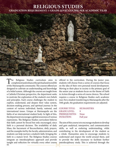 he Religious Studies curriculum aims to complement and enhance the spiritual and moral life of the Marianapolis community. The courses offered are designed to cultivate an understanding and knowledge of a belief system. Although the courses are taught from a Catholic/Christian perspective, the department seeks to motivate the exploration of the student’s own beliefs and principles. Each course challenges the student to explore, understand, and deepen their value system, decision-making process, and spiritual journey in the context of various individual, family, national, and international issues. Unique at Marianapolis are the faiths of an international student body. In light of this, the department encourages a global awareness of various expressions. The Religious Studies curriculum believes that faith cannot be forced but only encouraged, since faith is a personal decision. The availability of daily Mass, the Sacrament of Reconciliation, daily prayers, and the examples led by the faculty, administration, and students can help nurture a student’s faith, bringing the faith to a mature level. The Religious Studies courses integrate an interdisciplinary approach and provide insight and reflection for virtually every other course 61