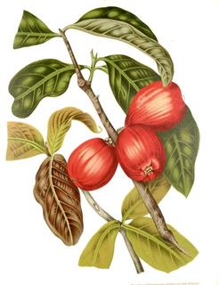 Drupa color gris o café, suspendida en el extremo por un pedicelo alargado y carnoso