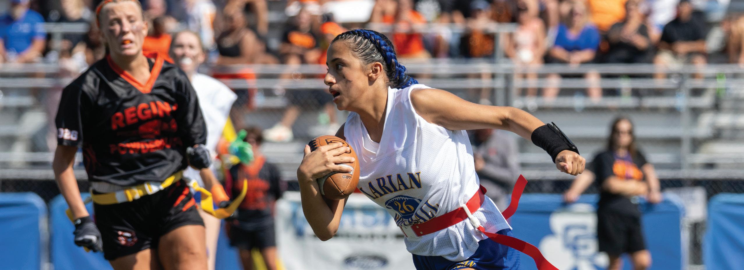 Among Marian’s most treasured traditions is Senior Football and the much-anticipated game against crosstown rival Regina. This year’s Marian team enjoyed warm temperatures, sunny skies, and a vibrant cheering section made up of generations of Marian alumnae. Marian graduates from the classes of 1995, 2000, 2005, and 2010 came together to celebrate their milestone reunions while cheering on their fellow Mustangs. Many alumnae brought with them their own young daughters, future Mustangs, for a chance to see up close the sisterhood that makes Marian so special.
