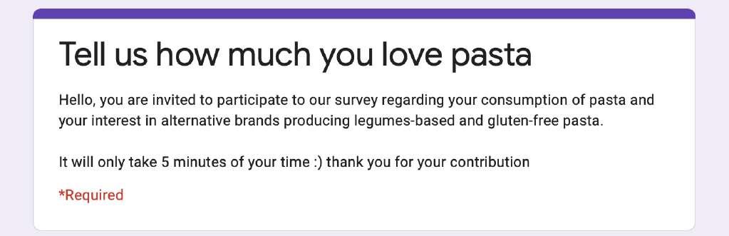 Additionally, a survey to which more than 50 people responded was created, the latter was helpful to gain more insights into the perception of alternative pasta in Italy and how this varies depending on age, background, region of origin, education, and other factors.
