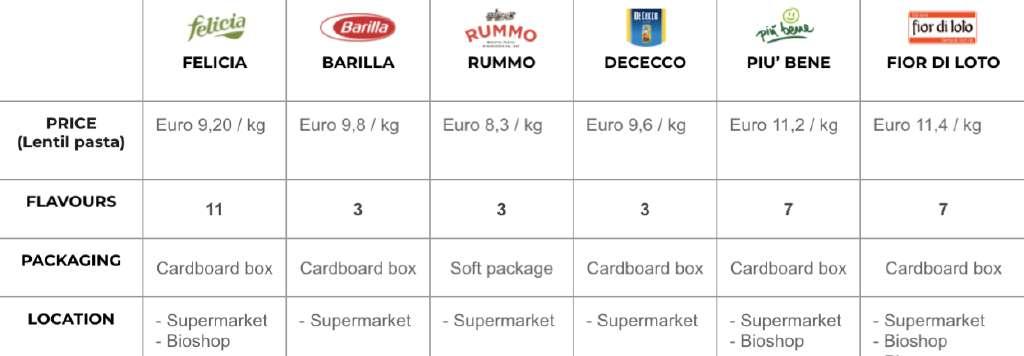 We conducted desk research on the health and Gluten Free trends globally, in Europe and Italy. Followed by an accurate analysis of the main brands of pasta present in Italy, compared based on price, flavors, packaging, and distribution centers.