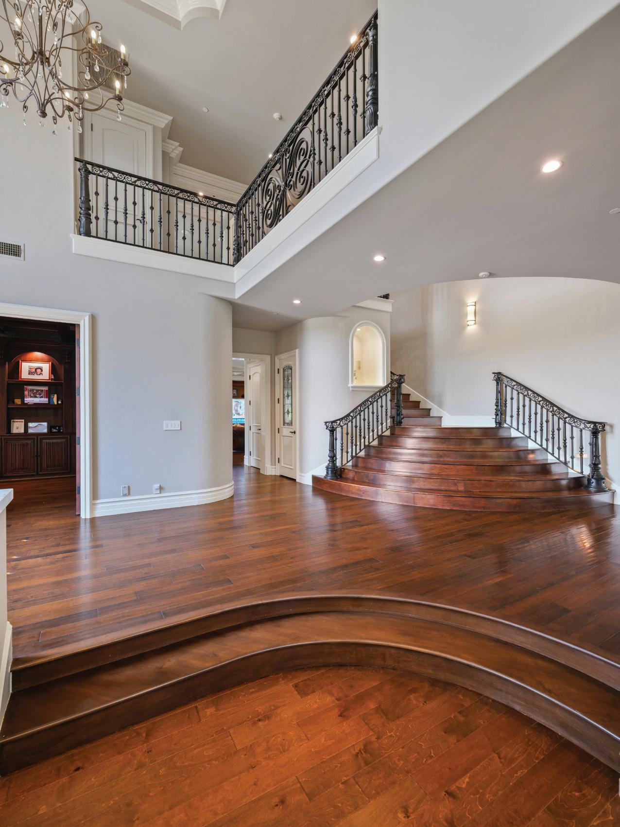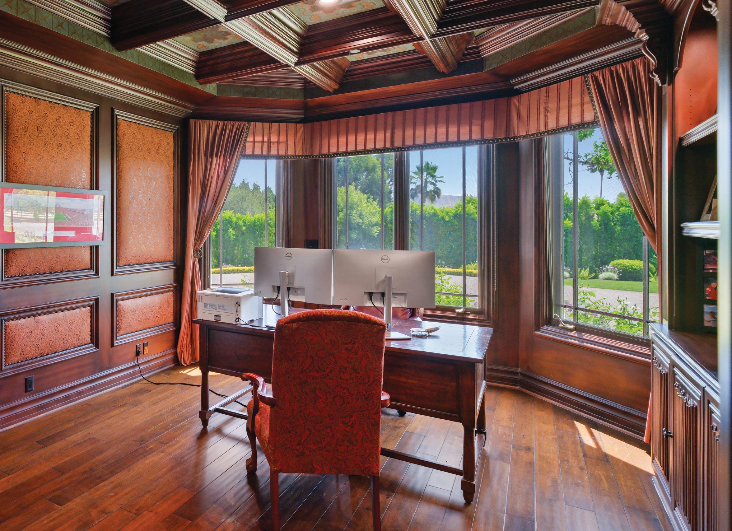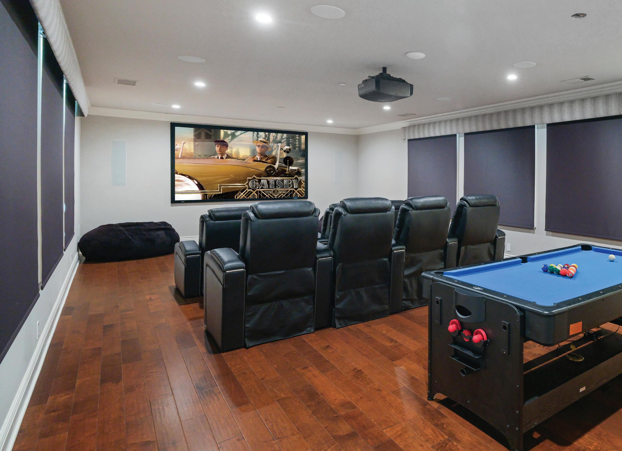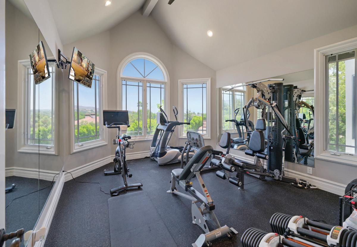 a gym, large bathroom and beautiful views of surrounding areas. The comfortable library has wood paneling and a temperature-controlled wine cellar. The spacious family room has a fully equipped bar and opens onto the beautiful kitchen with top-of-the-line appliances and walk-in pantry. The fantastic theater was recently completed. The dining room is perfectly sized to host large dinner parties with its convenient butler’s serving area. Upstairs is a bonus or TV room for kids or family nights. The elevator and smarthouse control system were recently renovated.