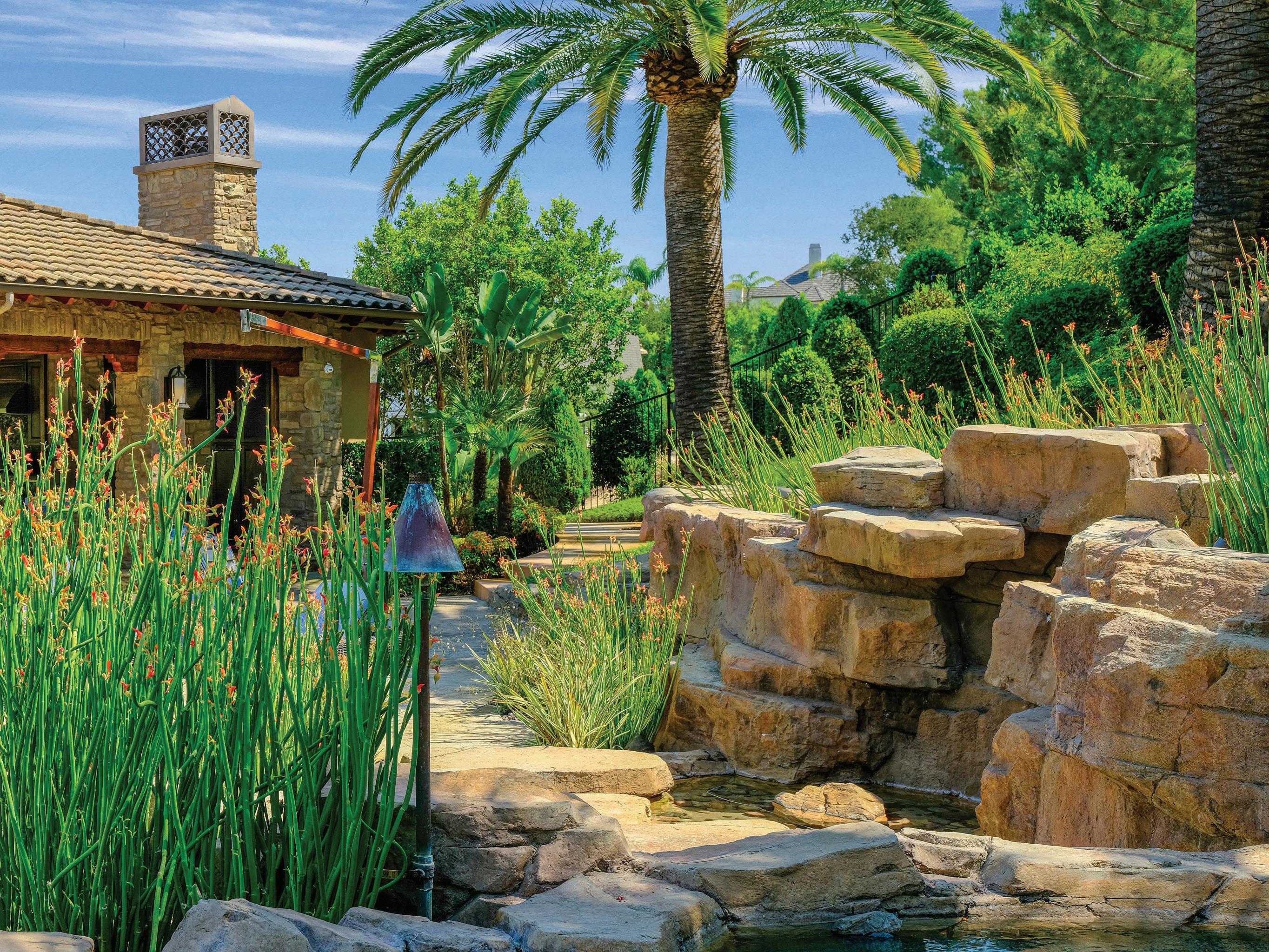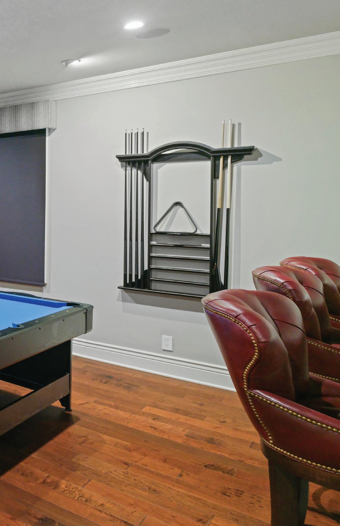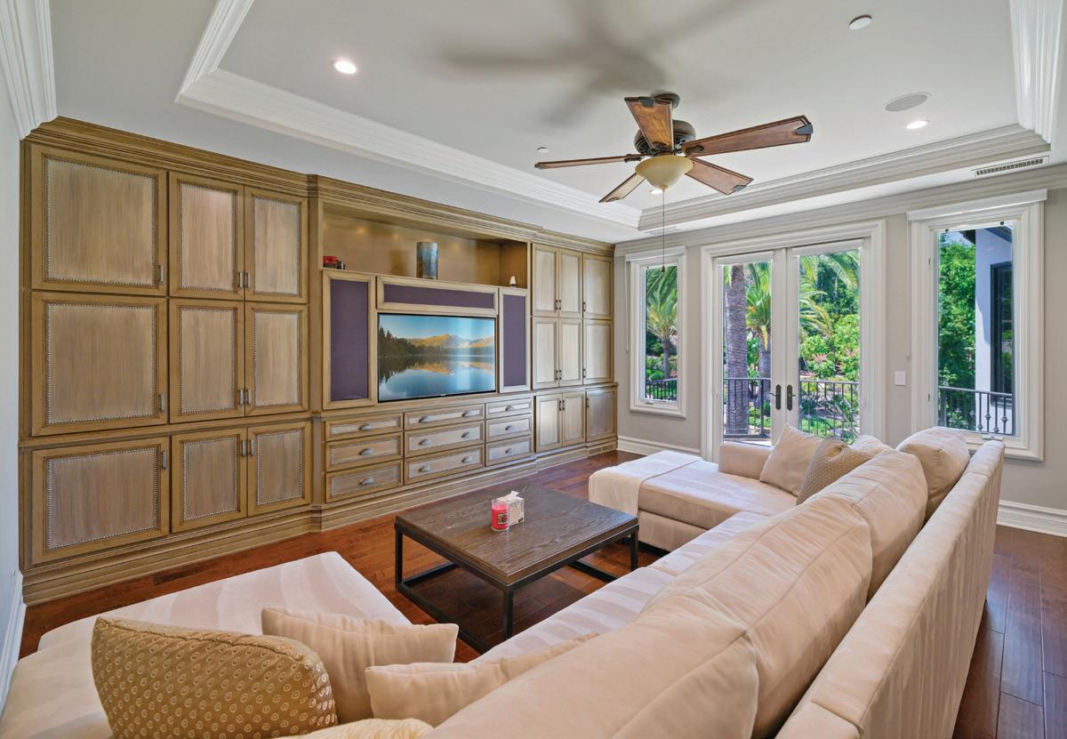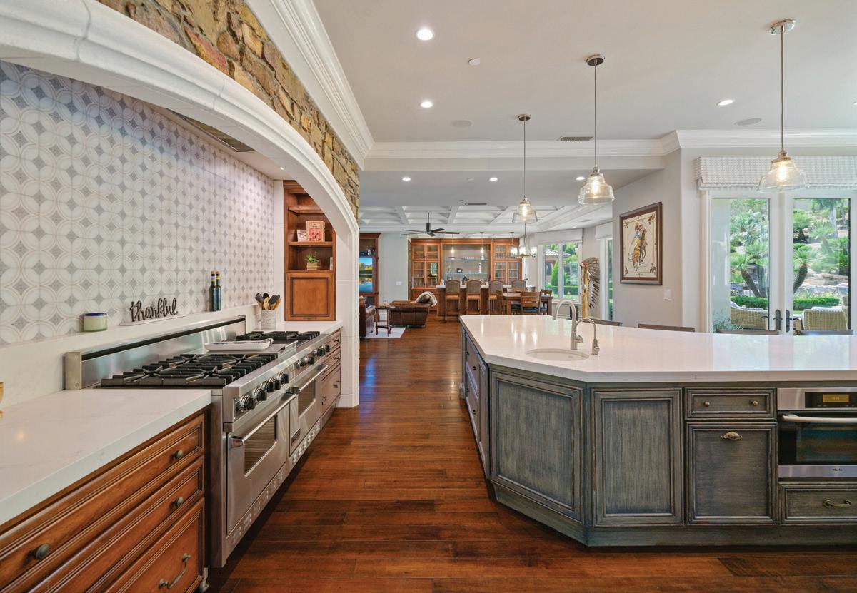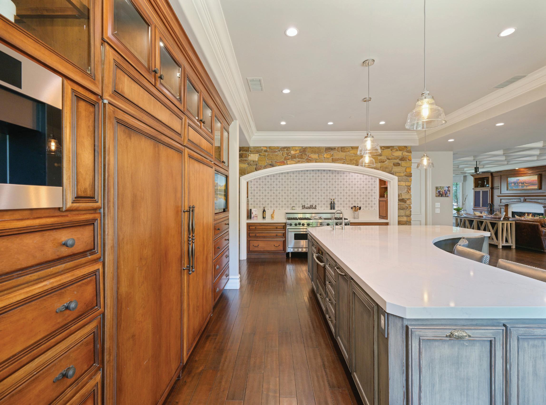 a gym, large bathroom and beautiful views of surrounding areas. The comfortable library has wood paneling and a temperature-controlled wine cellar. The spacious family room has a fully equipped bar and opens onto the beautiful kitchen with top-of-the-line appliances and walk-in pantry. The fantastic theater was recently completed. The dining room is perfectly sized to host large dinner parties with its convenient butler’s serving area. Upstairs is a bonus or TV room for kids or family nights. The elevator and smarthouse control system were recently renovated.