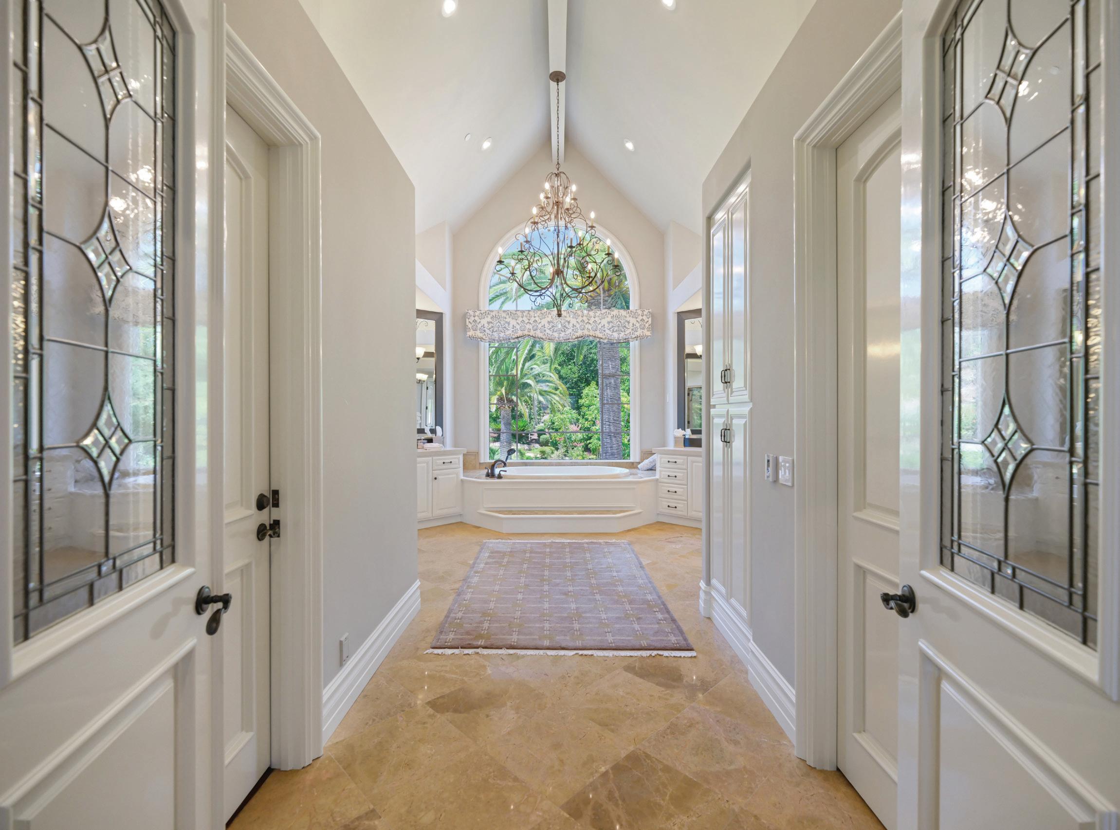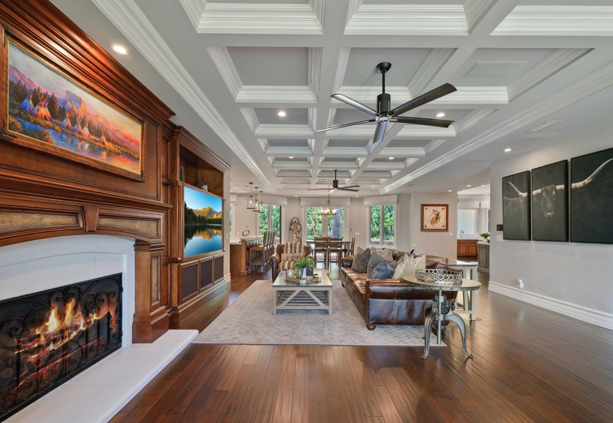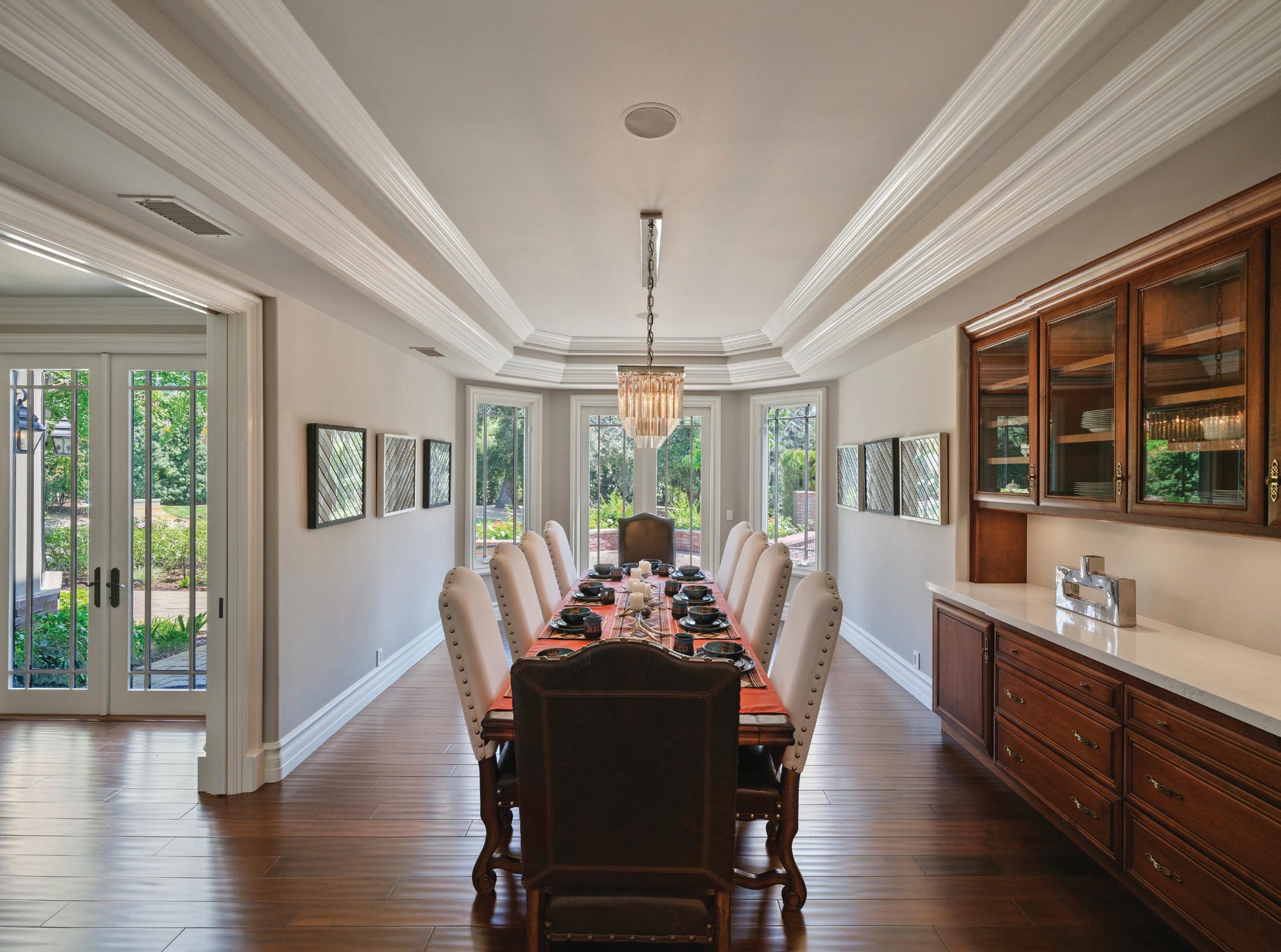The double-door entry opens to the foyer with soaring ceilings and views into the living room with a beautiful fireplace. The two-story home has six large bedrooms each with its own bathroom, two powder rooms and six oversized garages. Enjoy the luxurious primary suite with