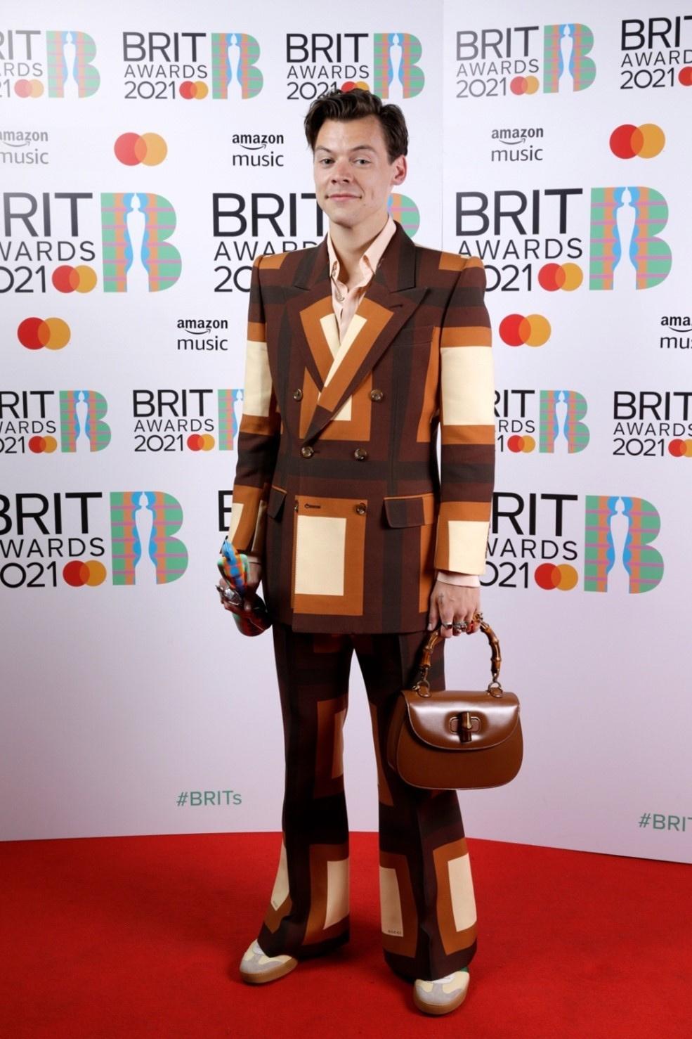 Por último, mas não menos importante, Harry Styles esbanjando todo seu charme fashionista O cantor usou um look geométrico de tom terrosos da grife Gucci, a calça no melhor modelo anos 1970, era mais larga na altura dos pés e para completar uma bolsa marrom