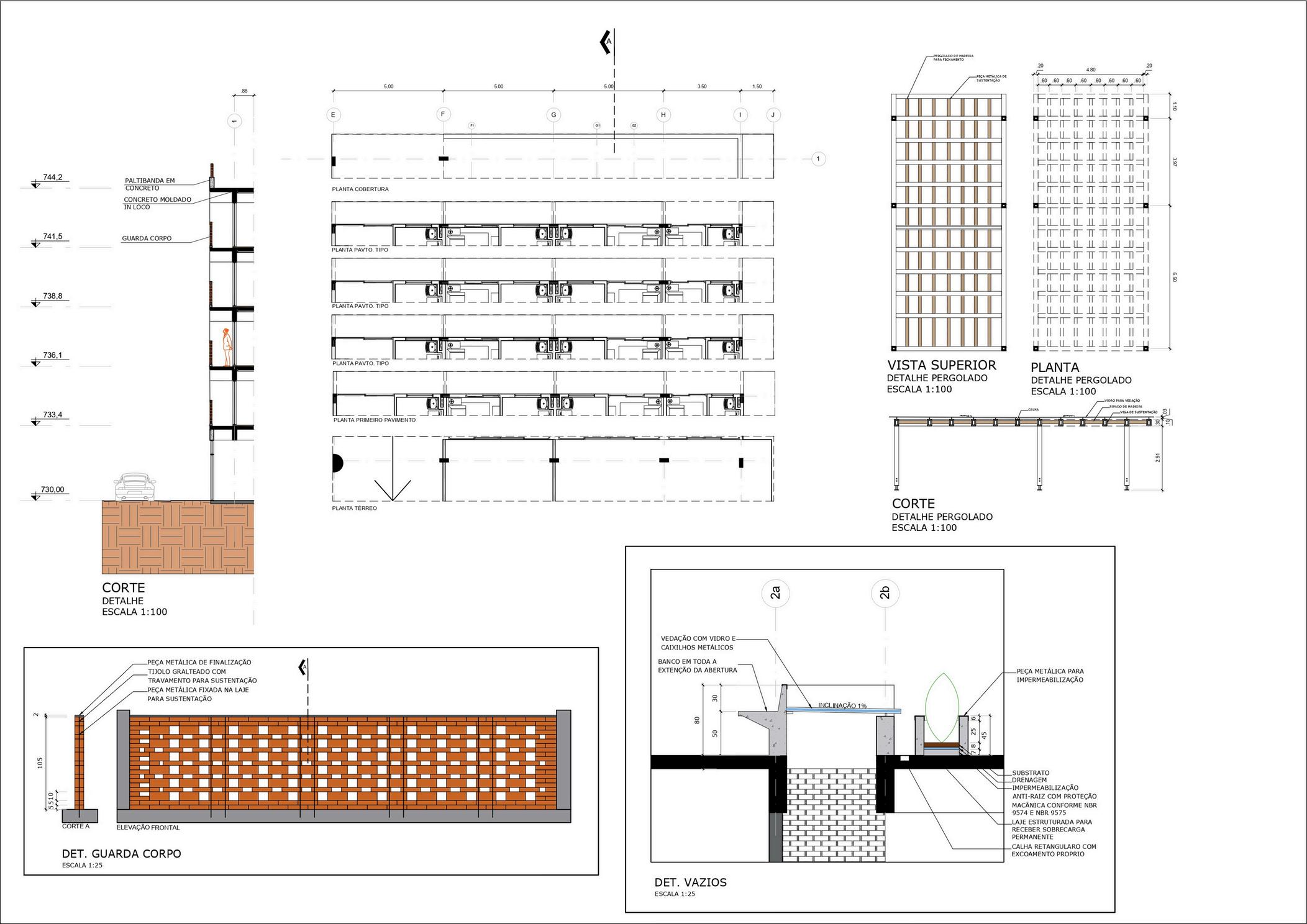 A proposta foi dividir o projeto em dois blocos interligados por uma praça central, recoberta por uma única cobertura plana. Além do acesso pelo térreo, despusemos, também, duas passarelas no 1º e 4º pavimentos das edificações.