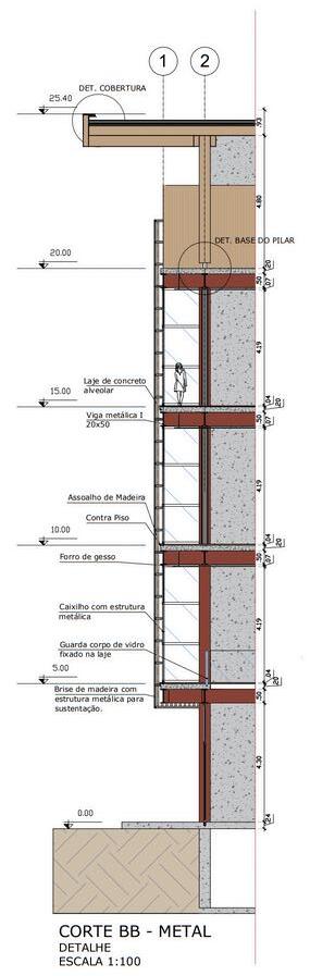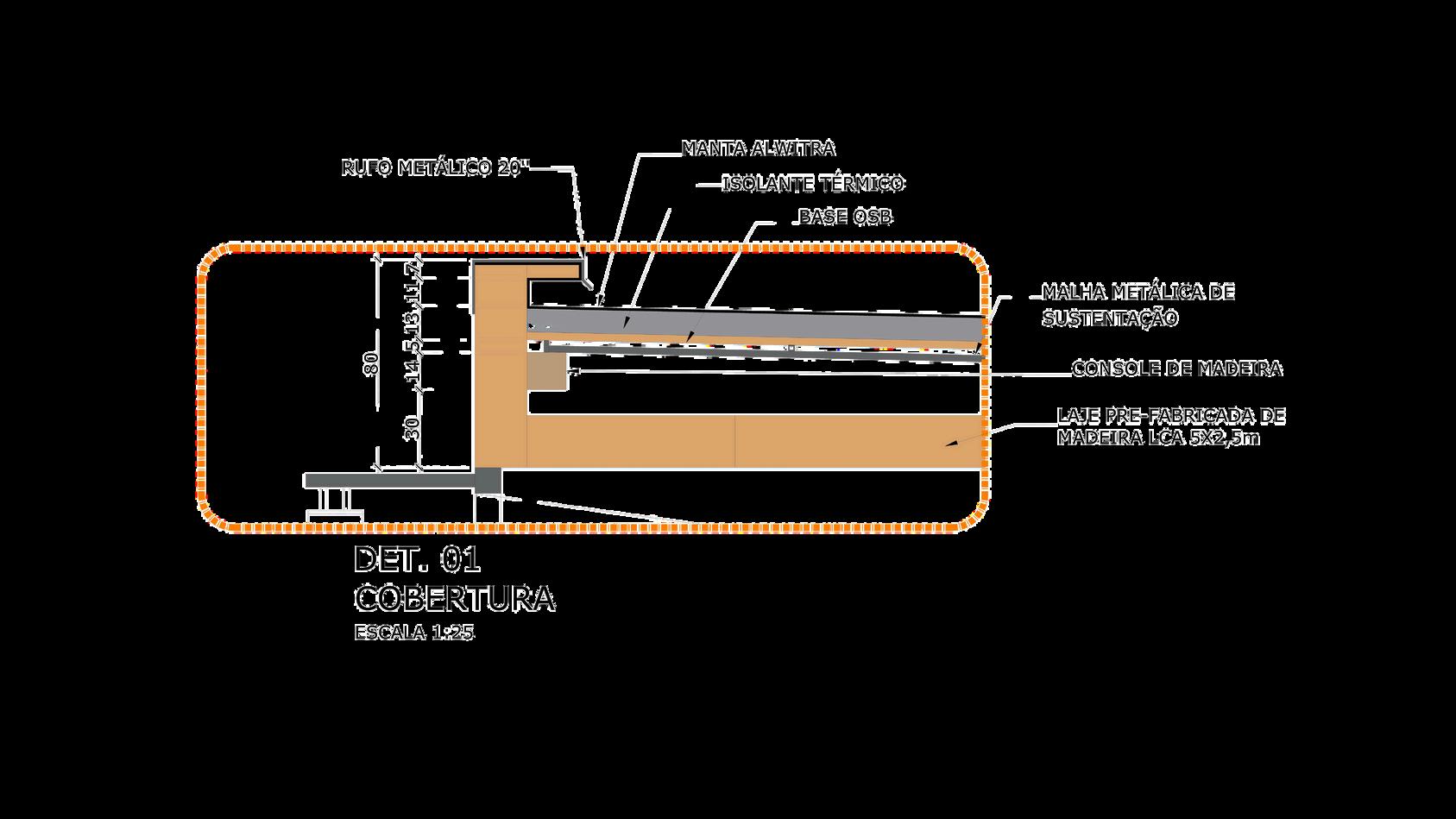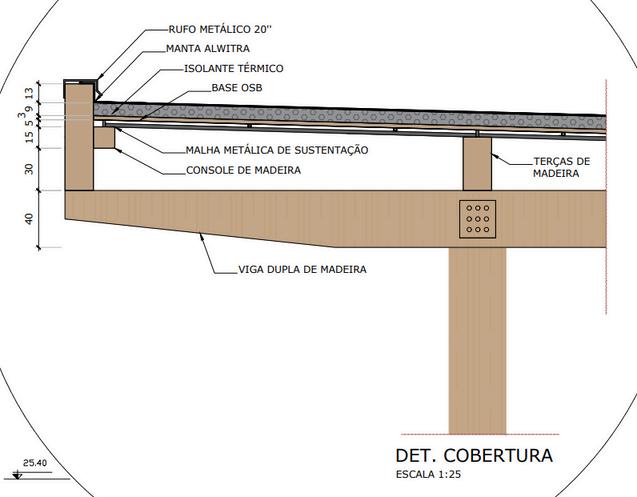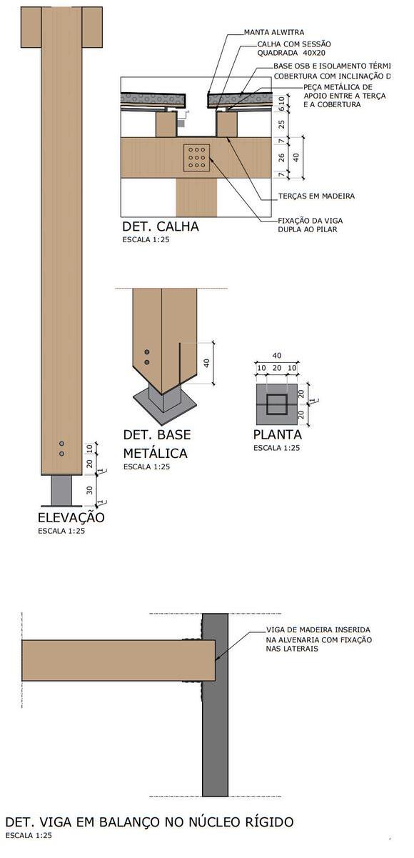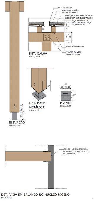 Já no bloco de oficinas, administração e salas de aula, utilizamos estrutura independente de madeira e núcleo rígido de concreto armado.