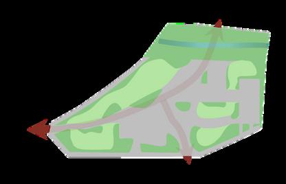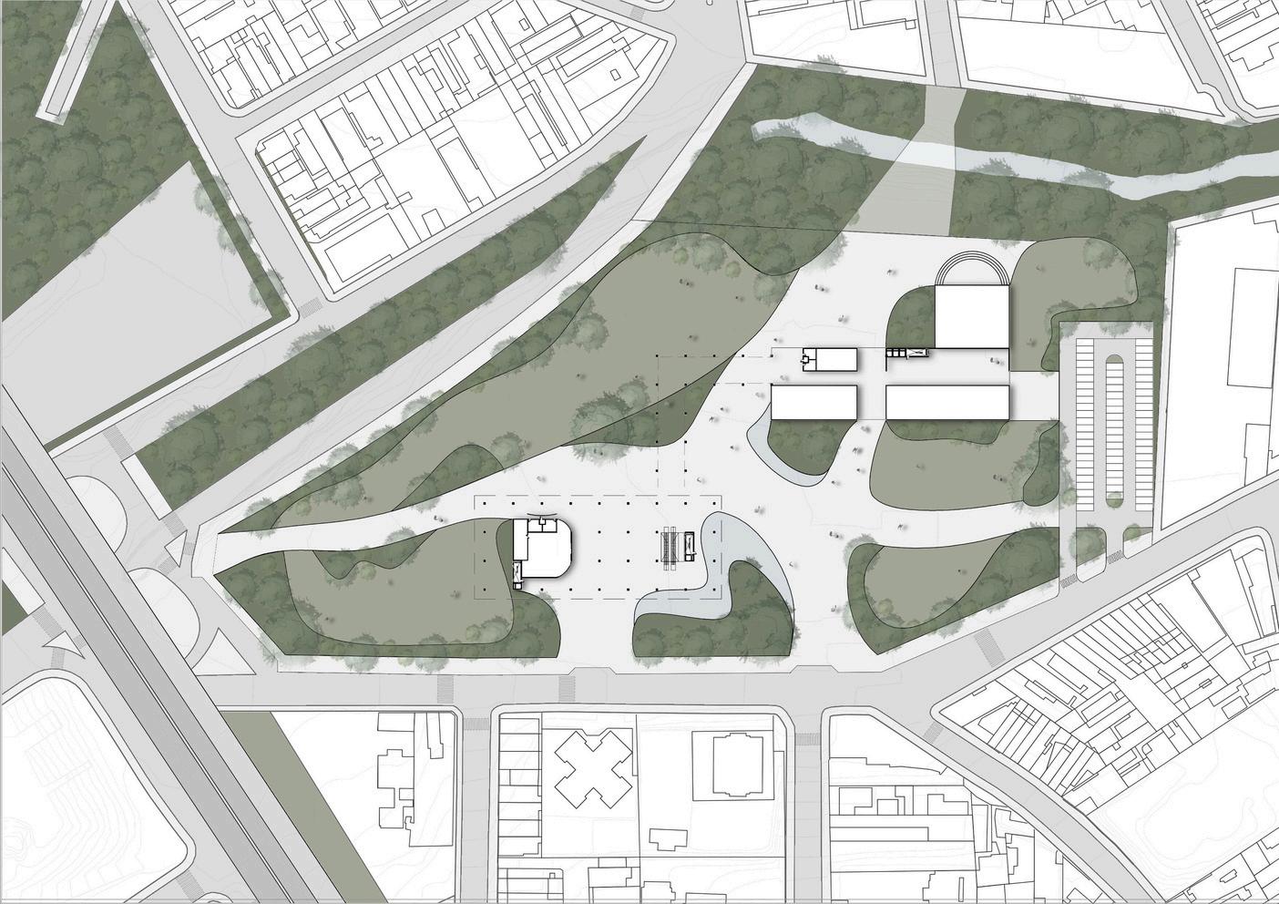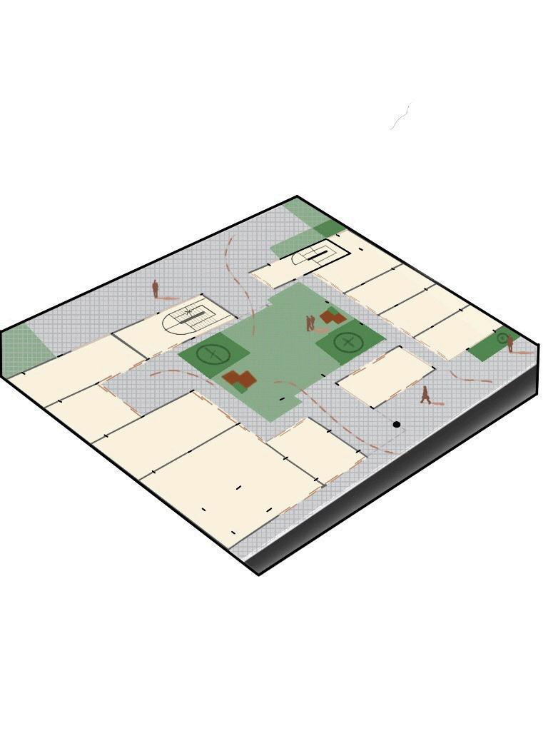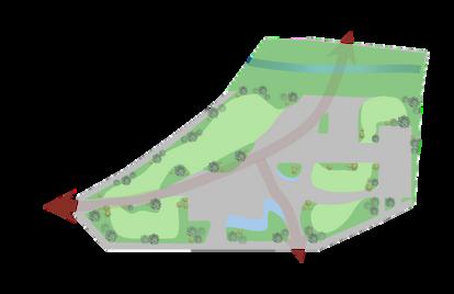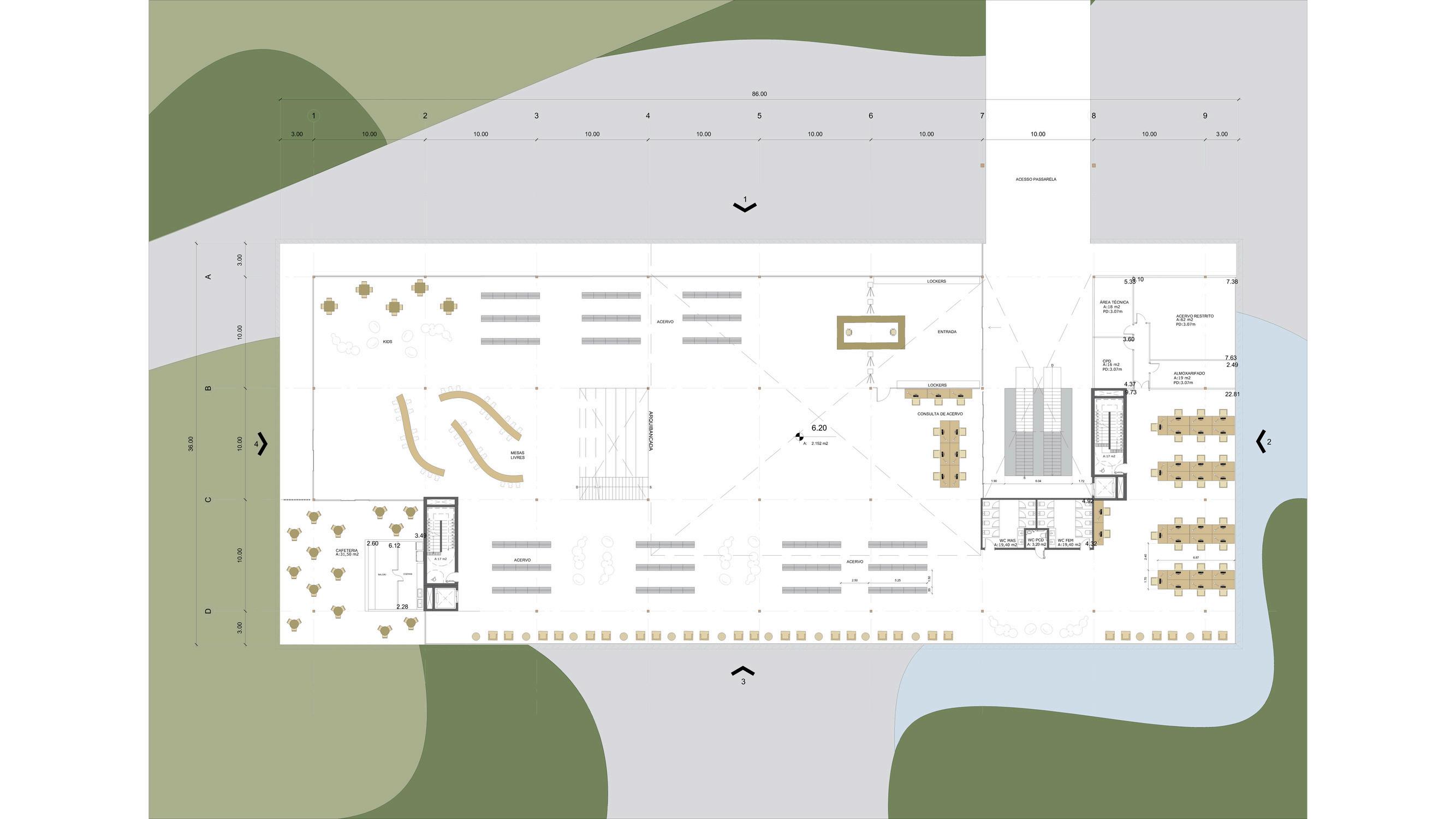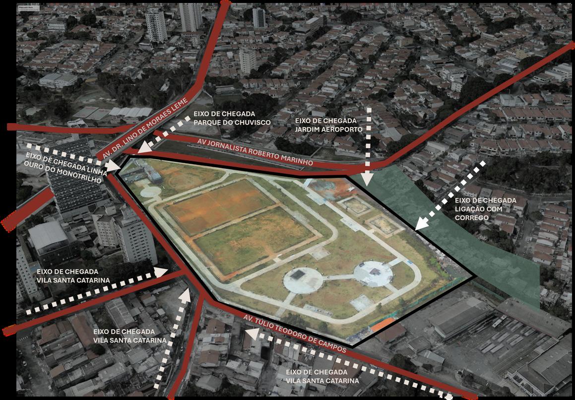 A partir da aproximação do terreno, foram traçados dois eixos que interligam os principais pontos de acesso do parque.
