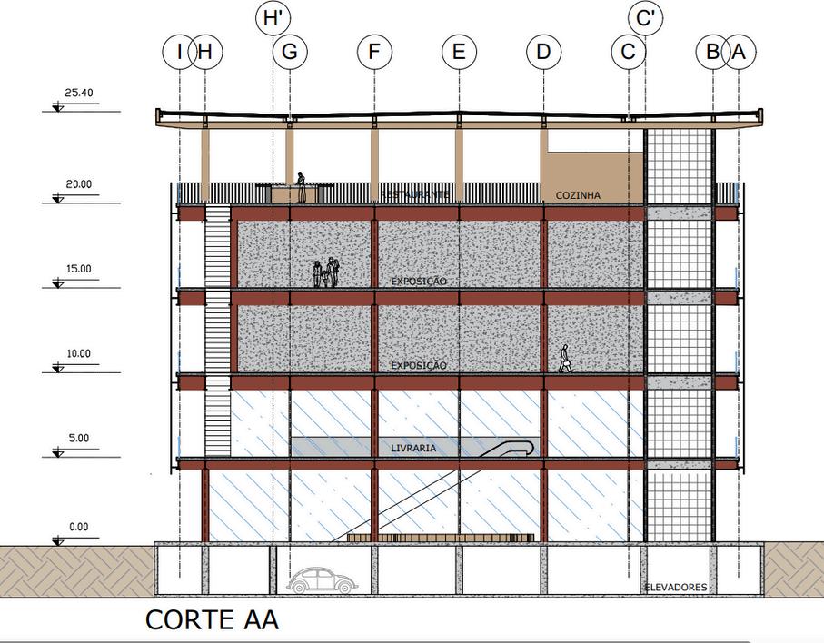 No bloco de acervo e de exposições (faceando a rua dos trilhos) a edificação foi pensada a partir de uma estrutura independente metálica, com núcleo rígido em concreto armado.