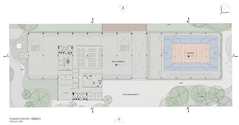 O projeto da escola foi pensado seguindo as normas do FDE e o maior desafio era o terreno com grande declive, que exigiu estudos aprofundados a cerca dos métodos estruturais possíveis. A edificação de dois andares conta com quadras e pátios internos e a acessibilidade também foi tema de estudo durante o semestre.