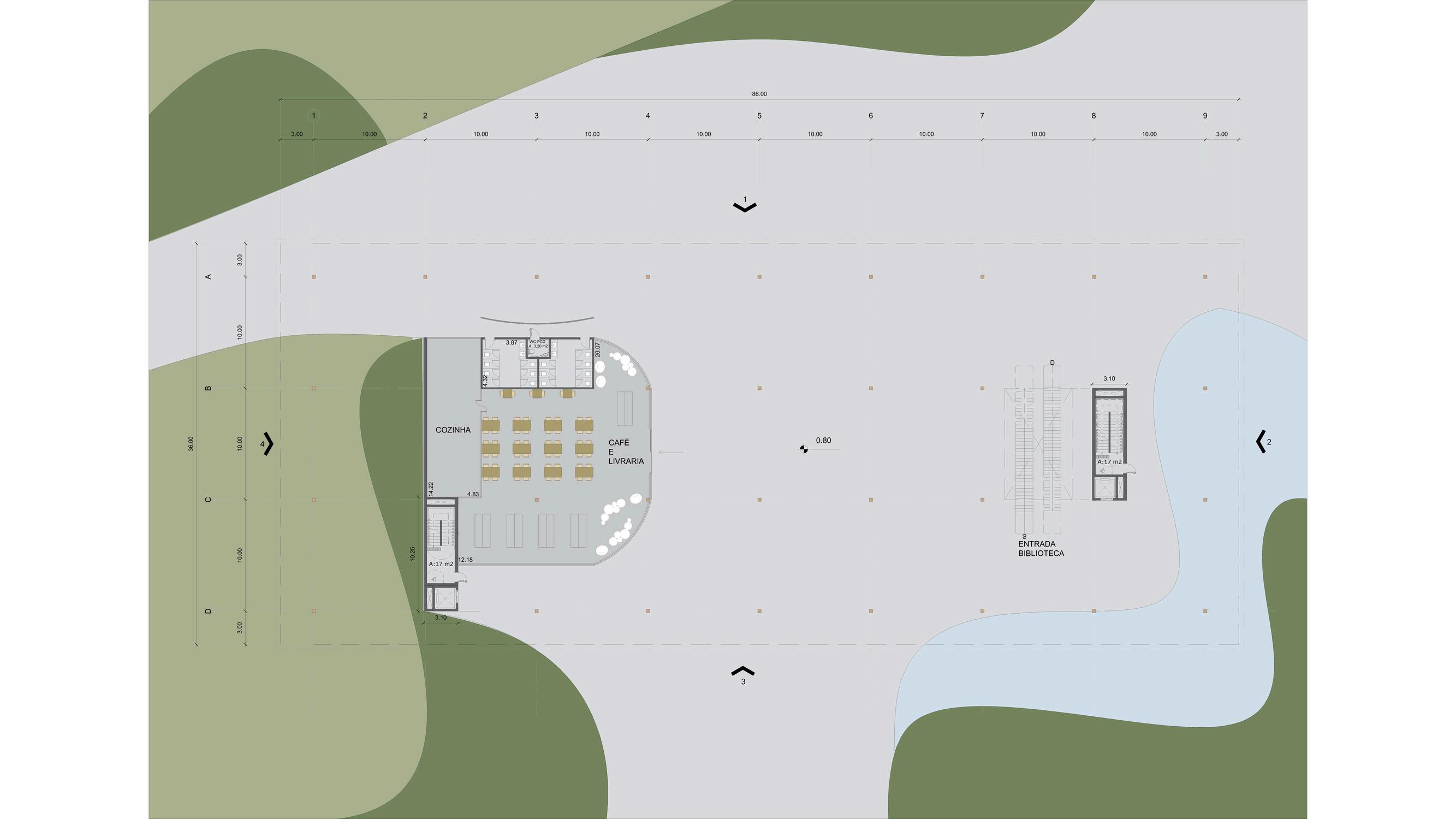 gramados, onde as diferentes praças se organizam (infantil, descanso, espaço pet); e jardins, com diferentes vegetações que possibilitam a divisão entre os espaços de forma sutil, além de criarem barreiras sonoras e visuais.