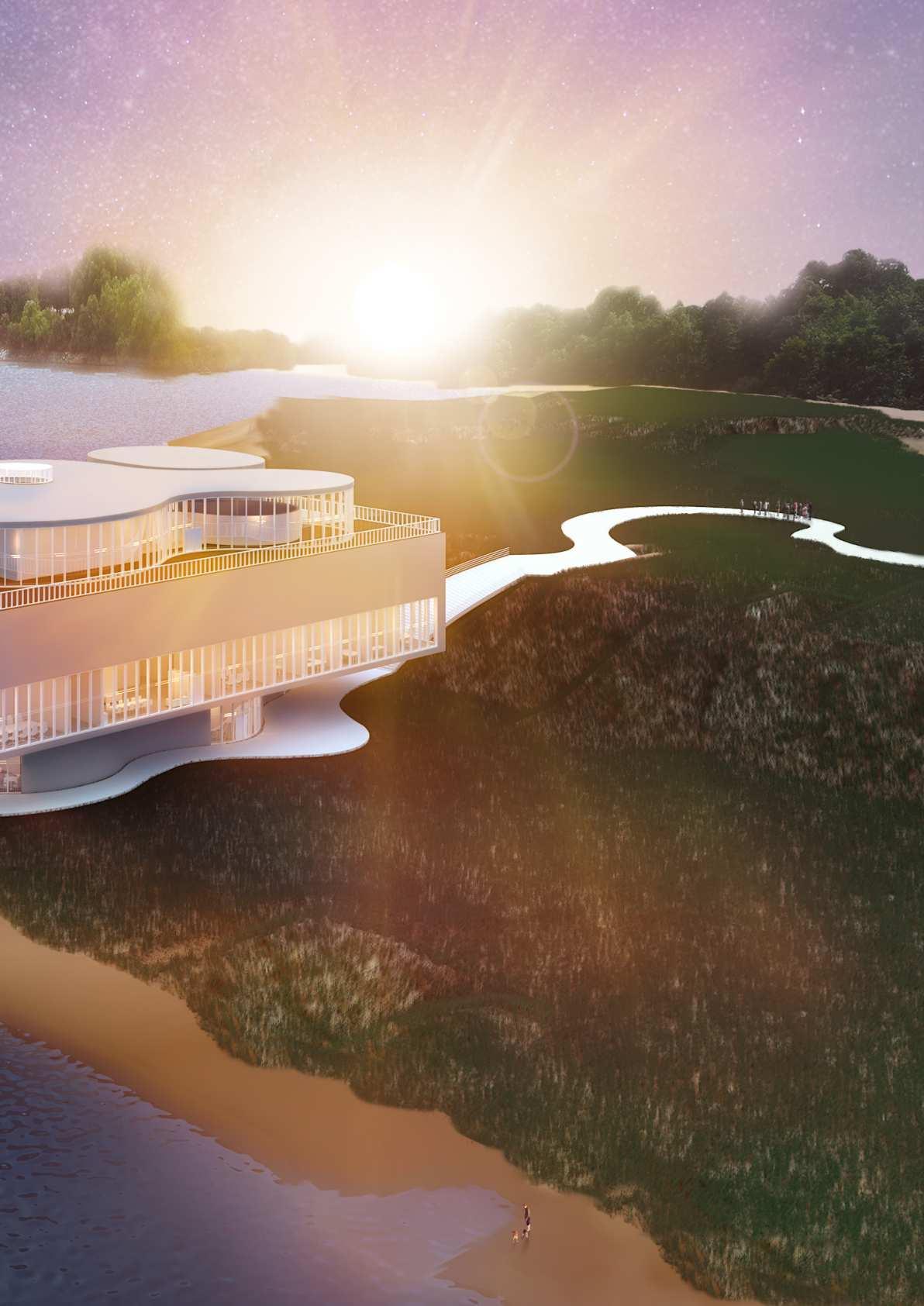 Water passage into the lake and river is slowed through planting, terracing, and attenuation ponds. Bamboo plants clean the water. Bamboo biomass is cropped and used for heating and as a sustainable building material. The buildings are draped with a rainwater and dew harvesting membrane. This membraneisusedasascreenforprojecting media, including local traf昀椀c, public transport, weather information, entertainment. Biogas is manufactured from captured grey water, human waste, and factories, to provide a sustainable source of heating.