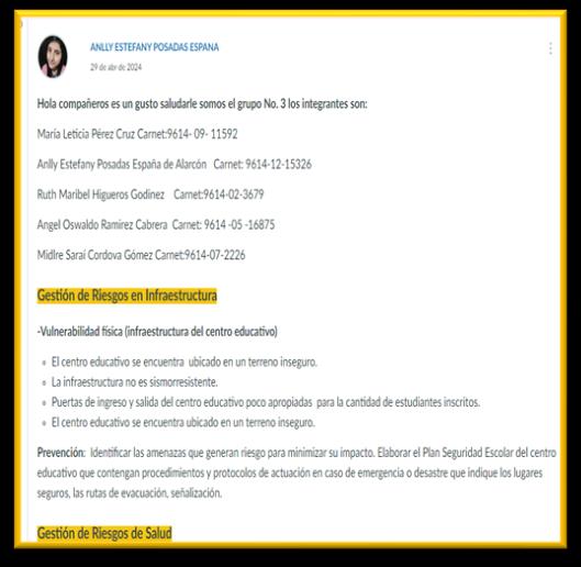 En esta tarea realizamos un foro grupal en el cual dimos los factores de riesgo de infraestructura, salud, seguridad escolar y clima que afectan la educación con el fin de dar a conocer las áreas vulnerables de cada factor y posibles soluciones, varios compañeros nos comentaron el trabajo publicado y nosotros como equipo comentamos el trabajo de otros grupos dando así nuestra opinión sobre los factores vulnerables que afectan a la comunidad escolar. Mantener informada a la comunidad educativa sobre los riesgos y las medidas de prevención. Es importante identificar y monitorear a los miembros de la comunidad educativa que pueden ser vulnerables como niños, adultos mayores, personas con enfermedades crónicas, personas con discapacidad y las personas que se encuentran en algún tratamiento médico. Todos deben estar atentos a las disposiciones actualizadas emitidas por el Ministerio de Educación (Mineduc). Los miembros de la comunidad educativa que presenten algún síntoma asociado a la ola de calor deben abstenerse de asistir al centro educativo y acudir al centro de salud más cercano.