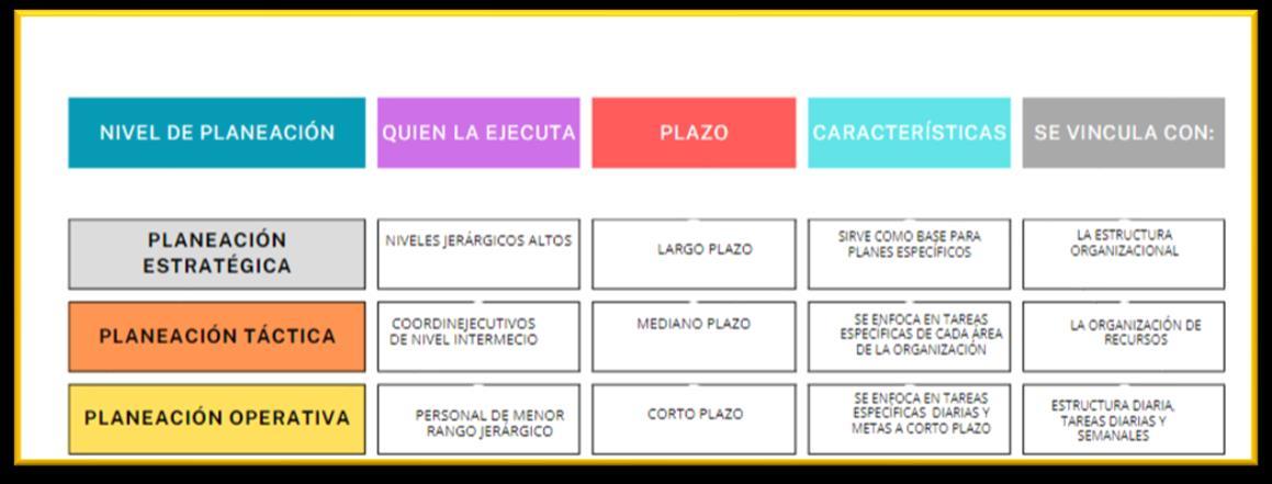 Planeación Táctica: este nivel se basa en la asignación de recursos y establecer planes de acciones a mediano plazo para lograr los objetivos estratégicos. Los planes tácticos suelen ser específicos de cada departamento o área funcional de la organización. Se enfoca en la realización de tareas específicas diarias y metas a corto plazo.