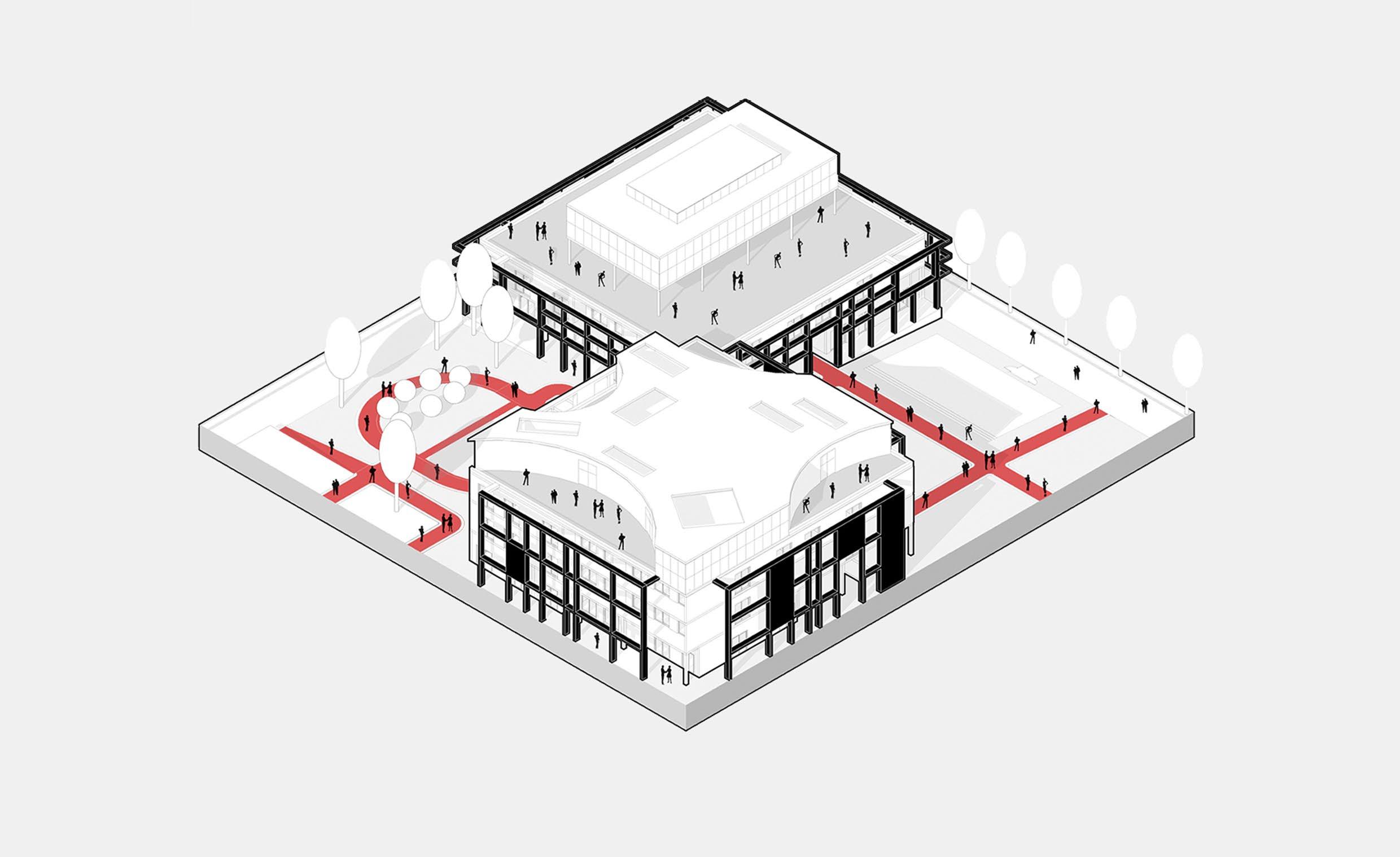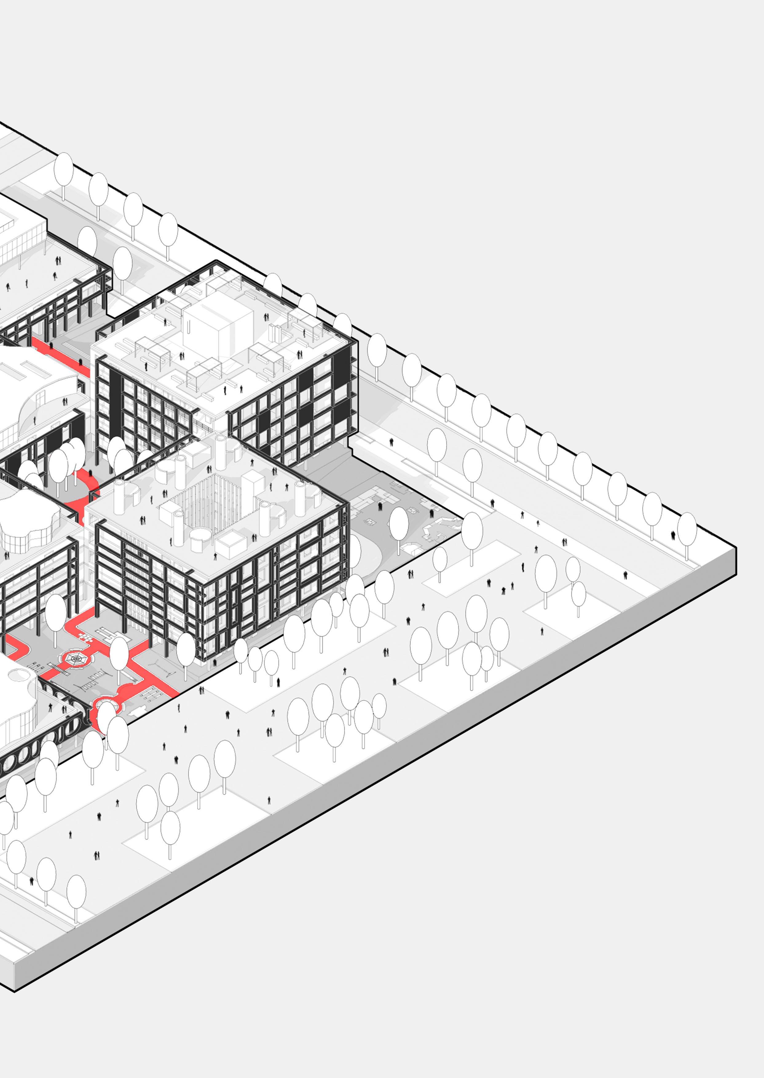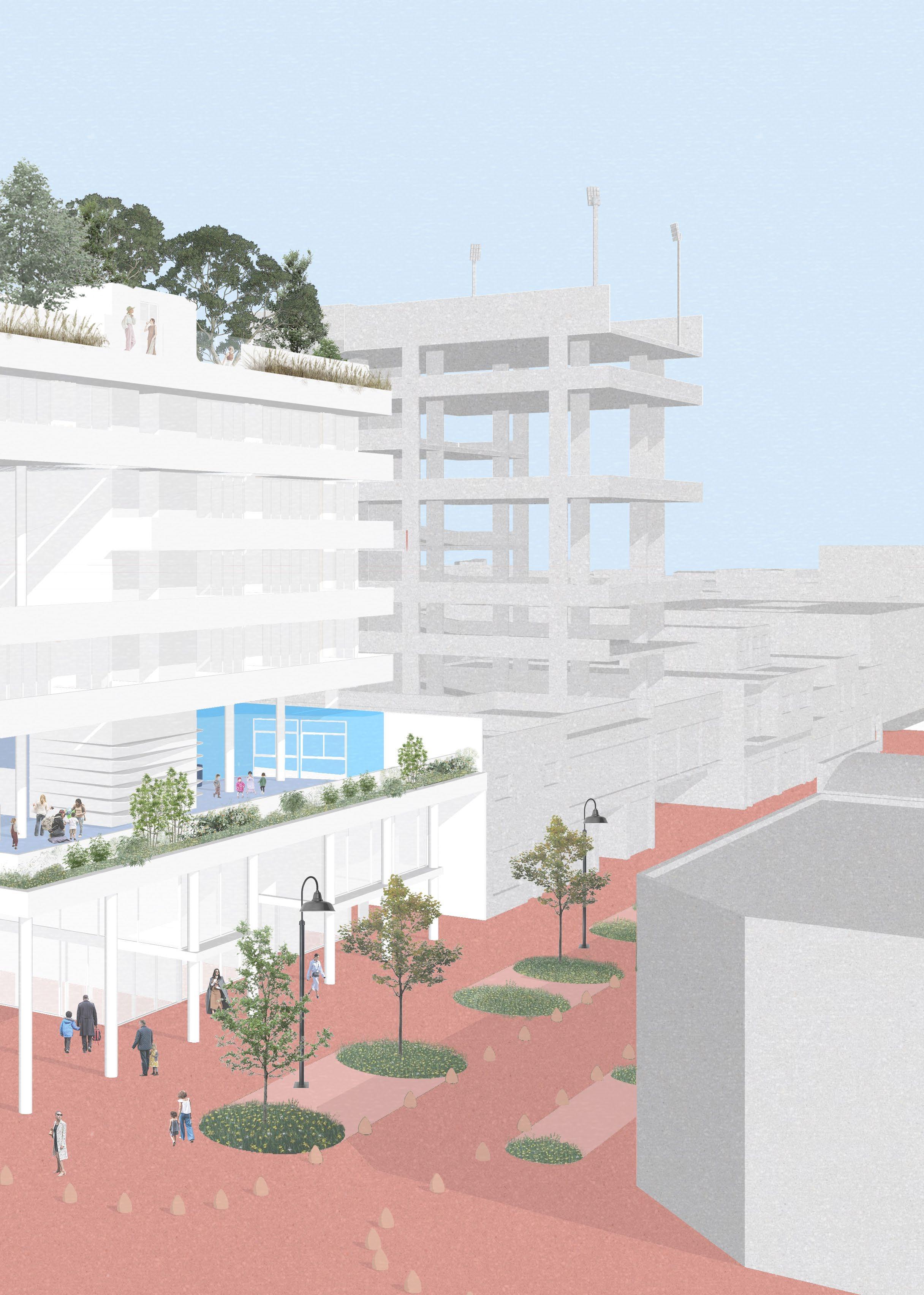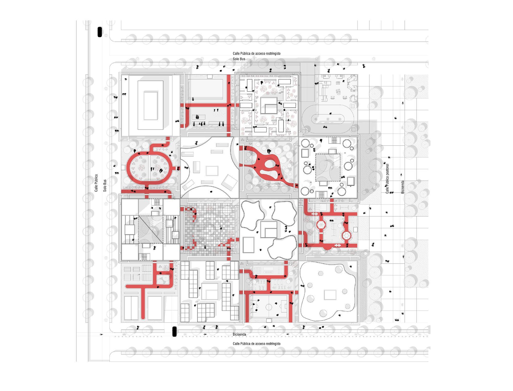 Se comparten las premisas de la cuadrícula vinculada al actual tejido de Mi Granja definiendo así un tablero de damas donde las negras son edificios y las blancas patios comunitarios. Se plantean distintos programas exteriores, permitiendo la diversidad y creando cohesión y comunidad, sumado a circulaciones exteriores que pasan a ser las arterias de movimiento.