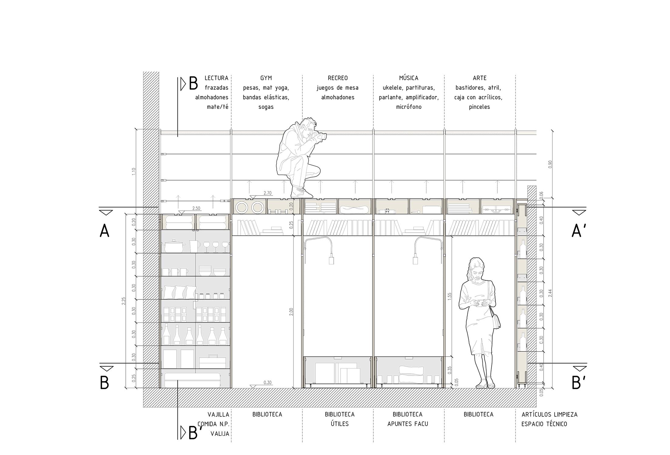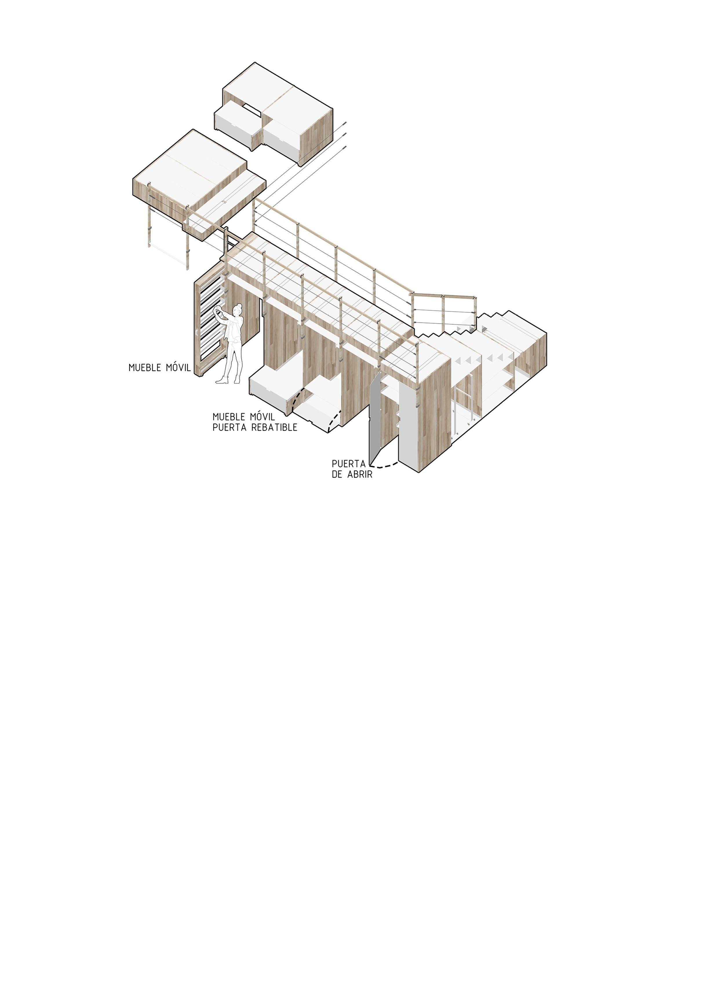 El diseño de este mueble habitable nace de una proyección de mis actividades esenciales en un programa concreto. Se hace referencia al tatami como módulo mínimo, estudiado para ser capaz de contener acciones ilimitadas que permiten definir la ocupación sin etiquetas. Es en esta idea modular en donde surgen cajas programáticas de 0,90m x 0,90m que se ubicarán a distintas alturas.