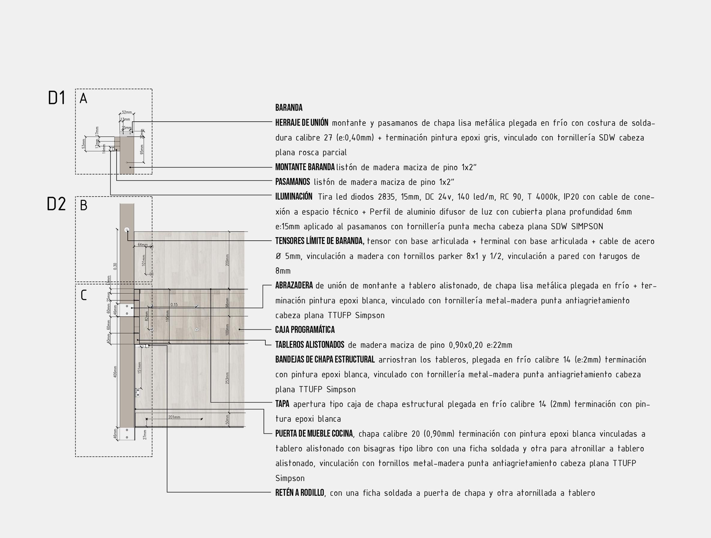 Los materiales esenciales del proyecto son los tableros alistonados de madera maciza para la estructura vertical y la chapa metálica plegada para puertas y mobiliarios.