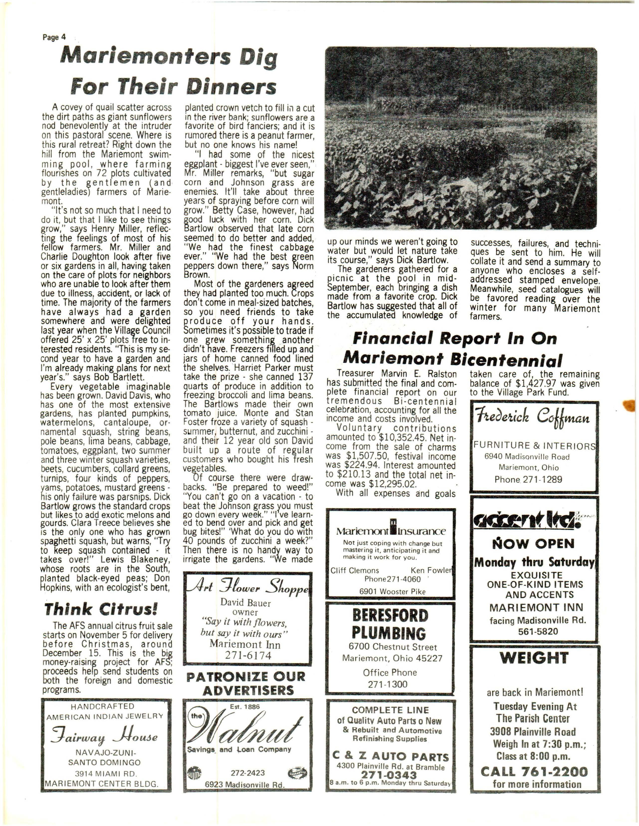 A covey of quail scatter across the dirt paths as giant sunflowers nod benevole ntly at the intruder on this pastor al scene. Wh ere is this rural retreat? Right down the hill from the Mariemont swimming pool, wh e r e farming flourishes on 72 plots cultivated by the g entlemen (and , gentl eladies) farm ers of Mariemont.