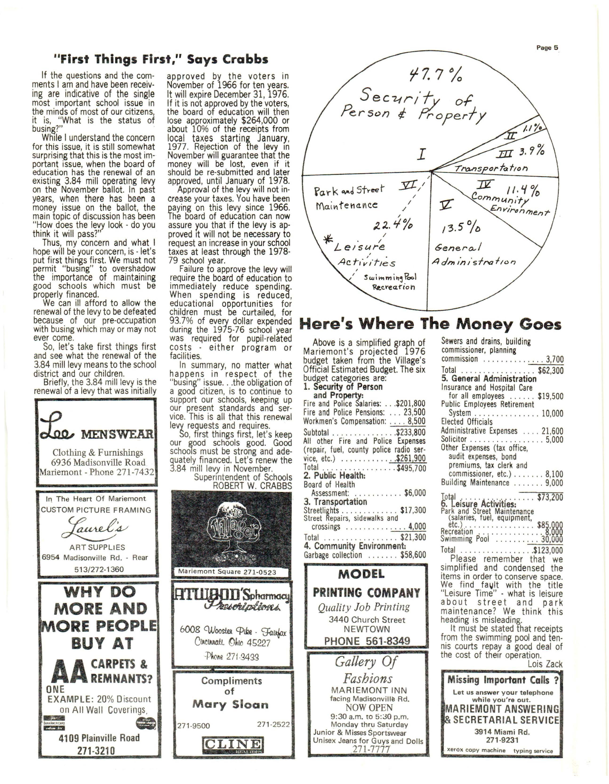 The Mariemont City School The Cincinnati case is unique in District has now been named in that Cincinnati has been found to th e amended comp laint filed by be an unsegregated district as the Nationa l Associa ti on for the recently as 1965 in the " Tina Advanceme nt of Colored People Deal" case Legal cases such as (NAACP) against the Cincinnati this one take a great deal of time Board of Education. We are one of to try and an appeal or appeals nineteen districts to be so includ- are almost guaranteed, no matter ed, 16 of which are alleged to which side wins The board exhave committed one or more acts pects that this could last through which are said to have caused a 1978 or longer Busing is not "imworsening of racial isolation in the minent" and, as a matter of fact, Cincinnati district. Three districts may neve r come. There has even are included as being necessary been talk of a constitu t ional for a metropolitan solution even ame nd ment to prevent massive th ough there are no allegatiom busing. against them