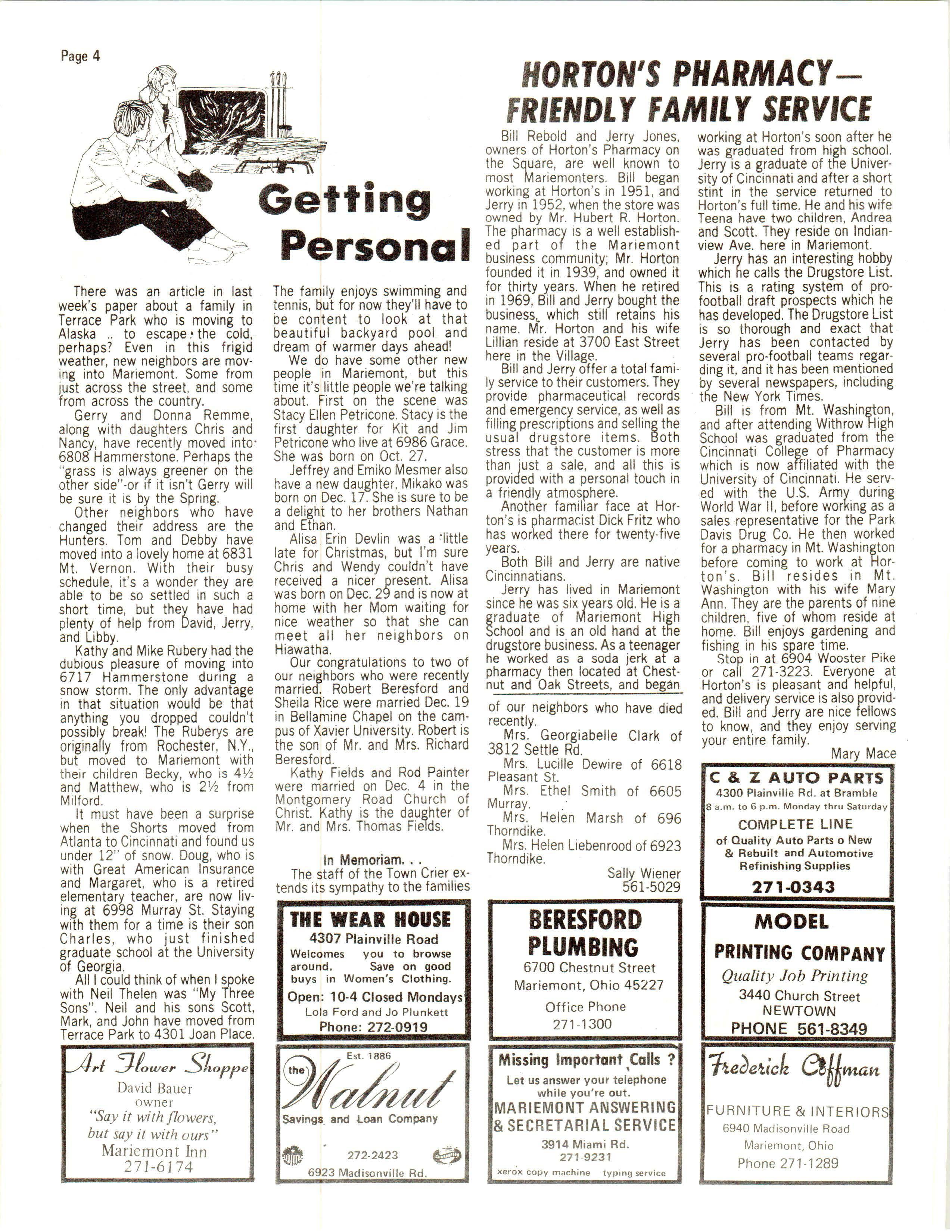 Bill Rebold and Jerry Jones owners of Horton ' s Pharmacy on the Sq ua re, are well known to most Mariemonters Bill began working at Horton ' s in 1951, and Jerry in 1952 , when the store was ow ned by Mr Hubert R. Horton. The pharmacy is a well est abl ished part of the Mariemont business community; Mr. Horton found ed it in 1939, and owned it for thirty years. When he retired in 1969, Bill and Jerry bought the busin ess ,. which still retains his name. Mr. Horton and his wife Lilli an reside at 3700 East Street here. in the Village