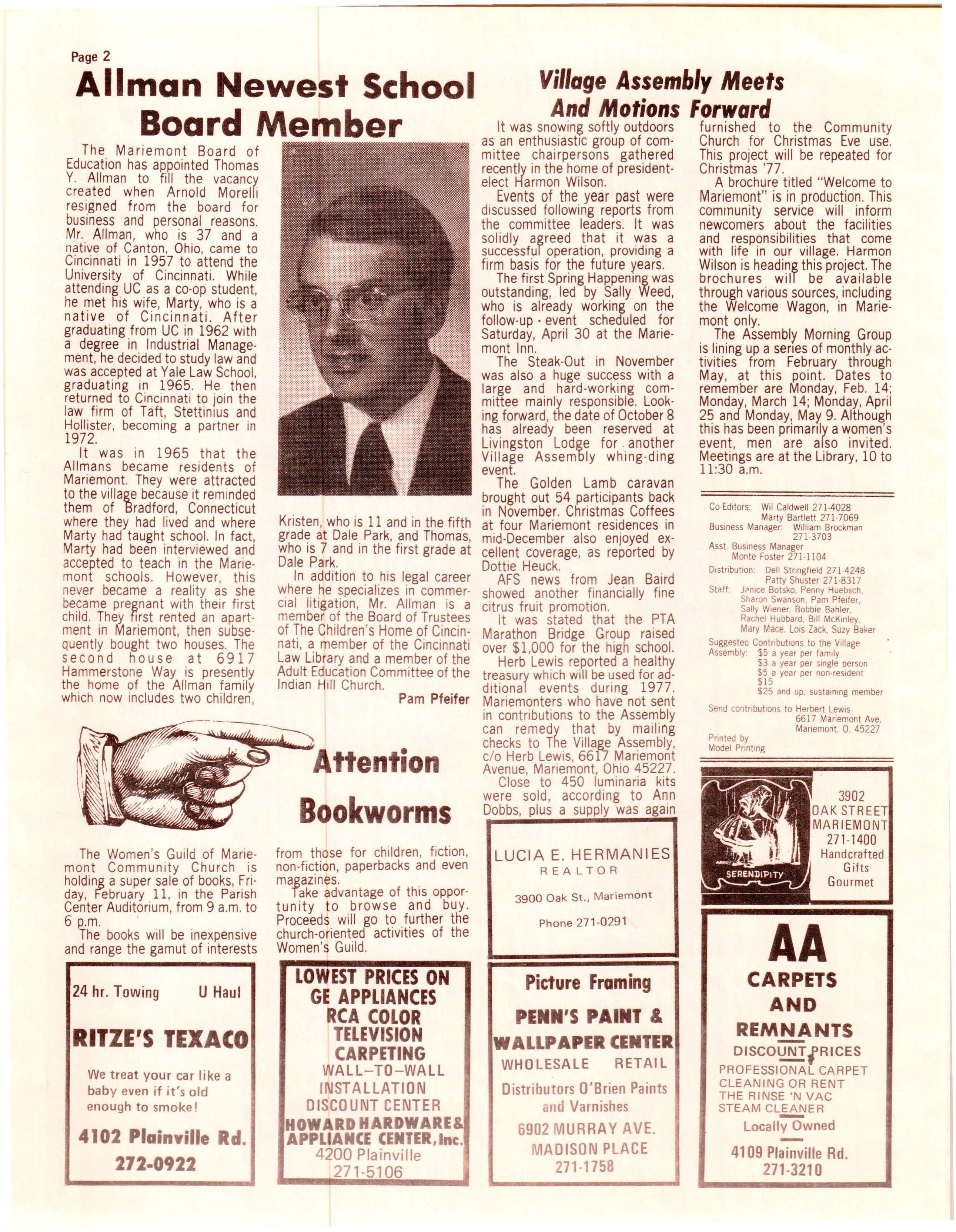 The Mariemont Board of Education has appointed Thomas Y Allman to fill the vacancy created when Arnold Morelli resigned from the board for business and personal reasons. Mr. Allman , who is 37 and a native of Canton , Ohio , came to Cincinnati in 1957 to attend the University of Cincinnati. While attending UC as a co-op student, he met his wife, Marty, who is a native of Cincinnati. After graduating from UC in 1962 with a degree in Indus trial Management, he decided to study law and was accepted at Yale Law School, graduating in 1965 He then returned to Cincinnati to join the law firm of Taft, Stettin1us and Hollister , becoming a partner in 1972