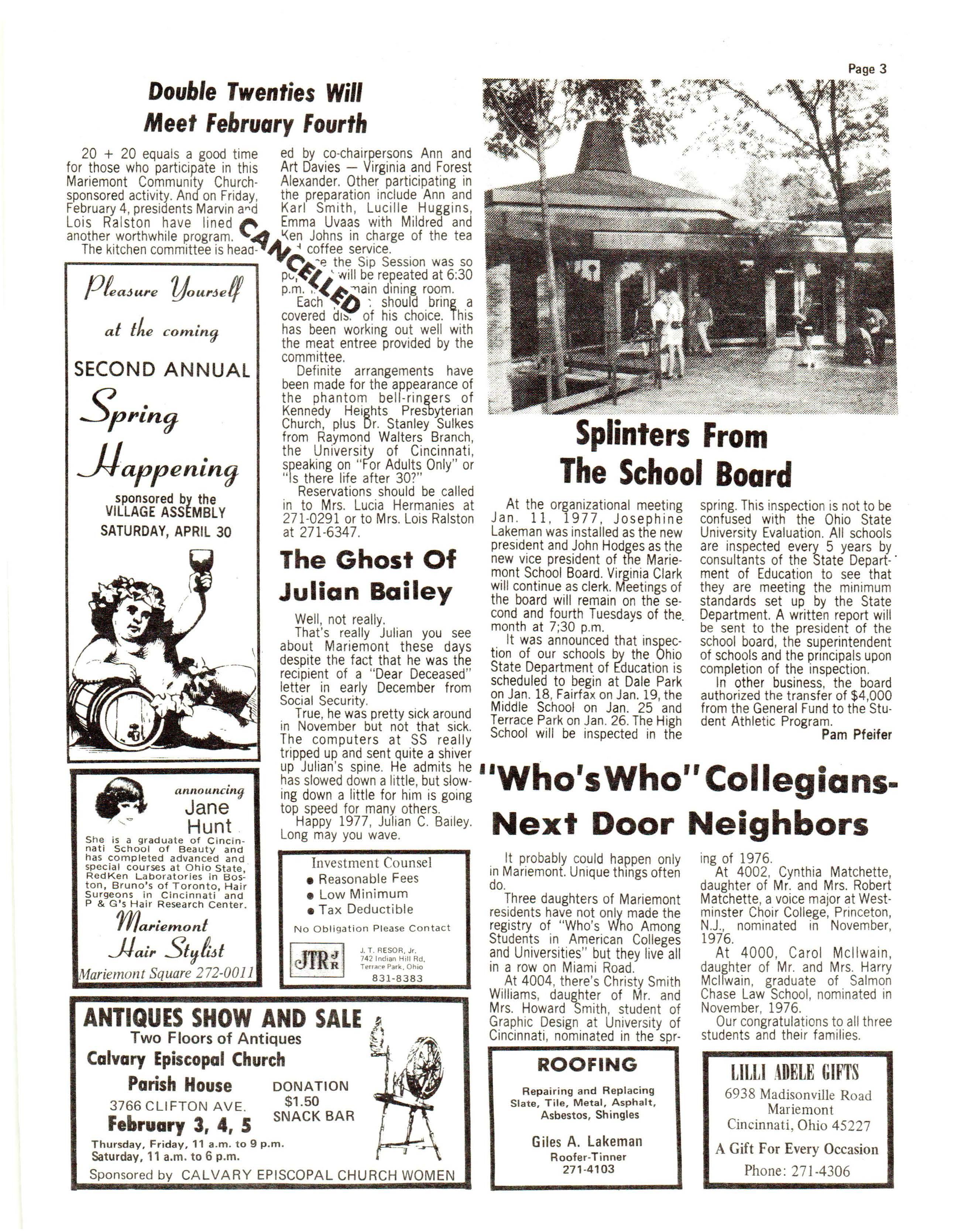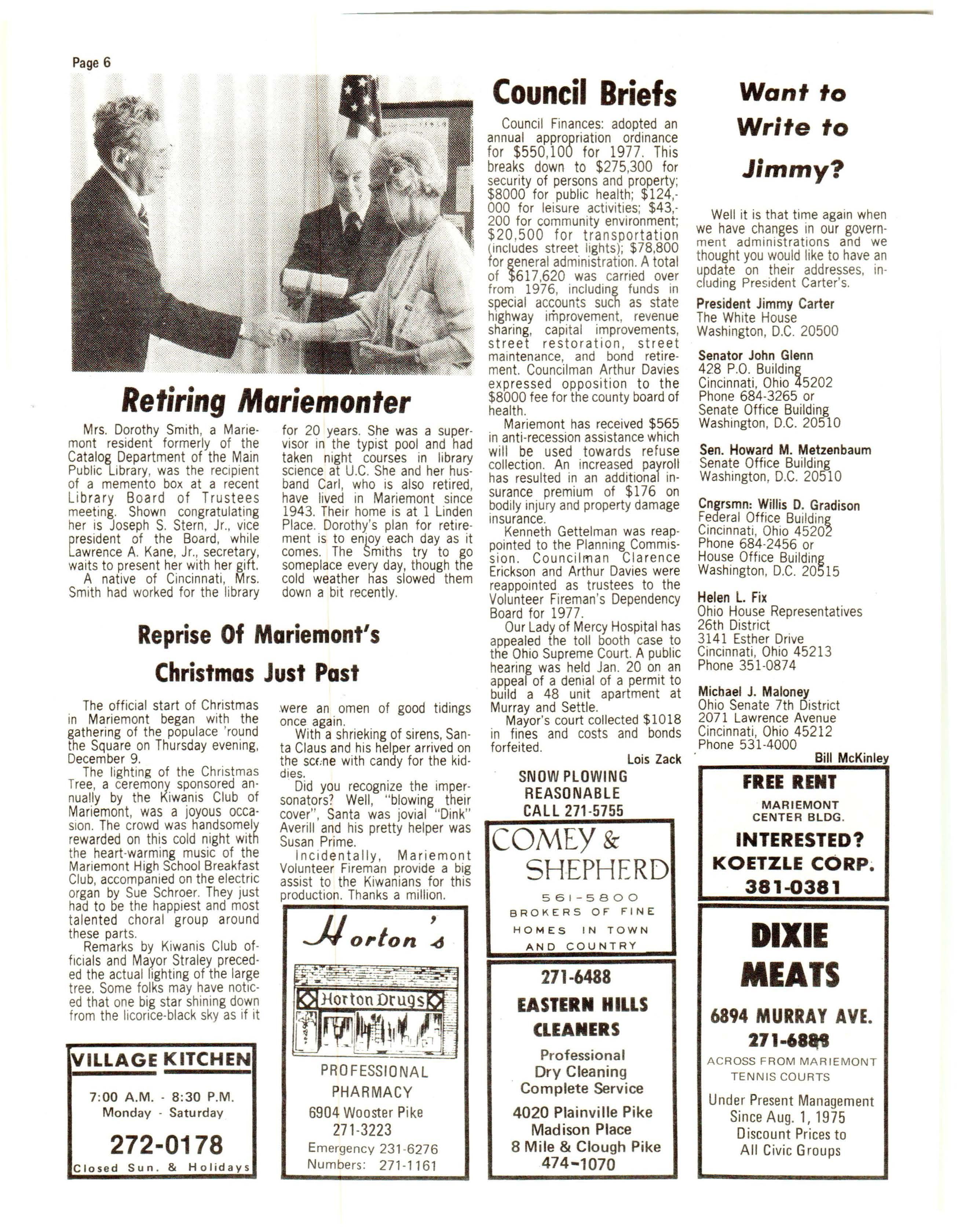 Herb Le wi s repo rted a hea lthy t reasu ry whic h will be used fo r additiona l even t s duri ng 1977. Mari emonte rs who have not sen t in co ntri buti ons t o t he Assembly can rem edy that by mai l ing ch ecks to Th e Vill age Assemb ly, c/o Herb Lewi s, 6617 Mar iemont Avenu e, Mariemont, Ohio 45 227. Close t o 4 50 lu min ari a ki ts were sold, acco rd ing t o Ann Dobbs , plus a supp ly was again