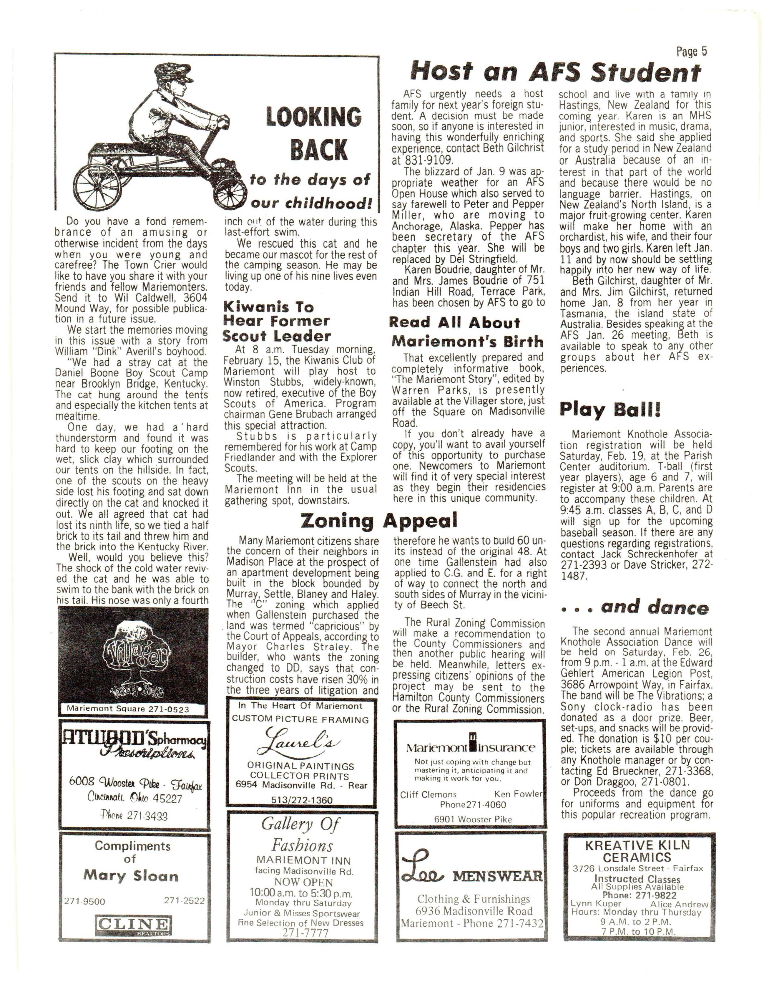Mariemont is a community of people with varied talents and needs. Why not use the Town Crier as a means of letting fe llow Mariemonters learn of these?