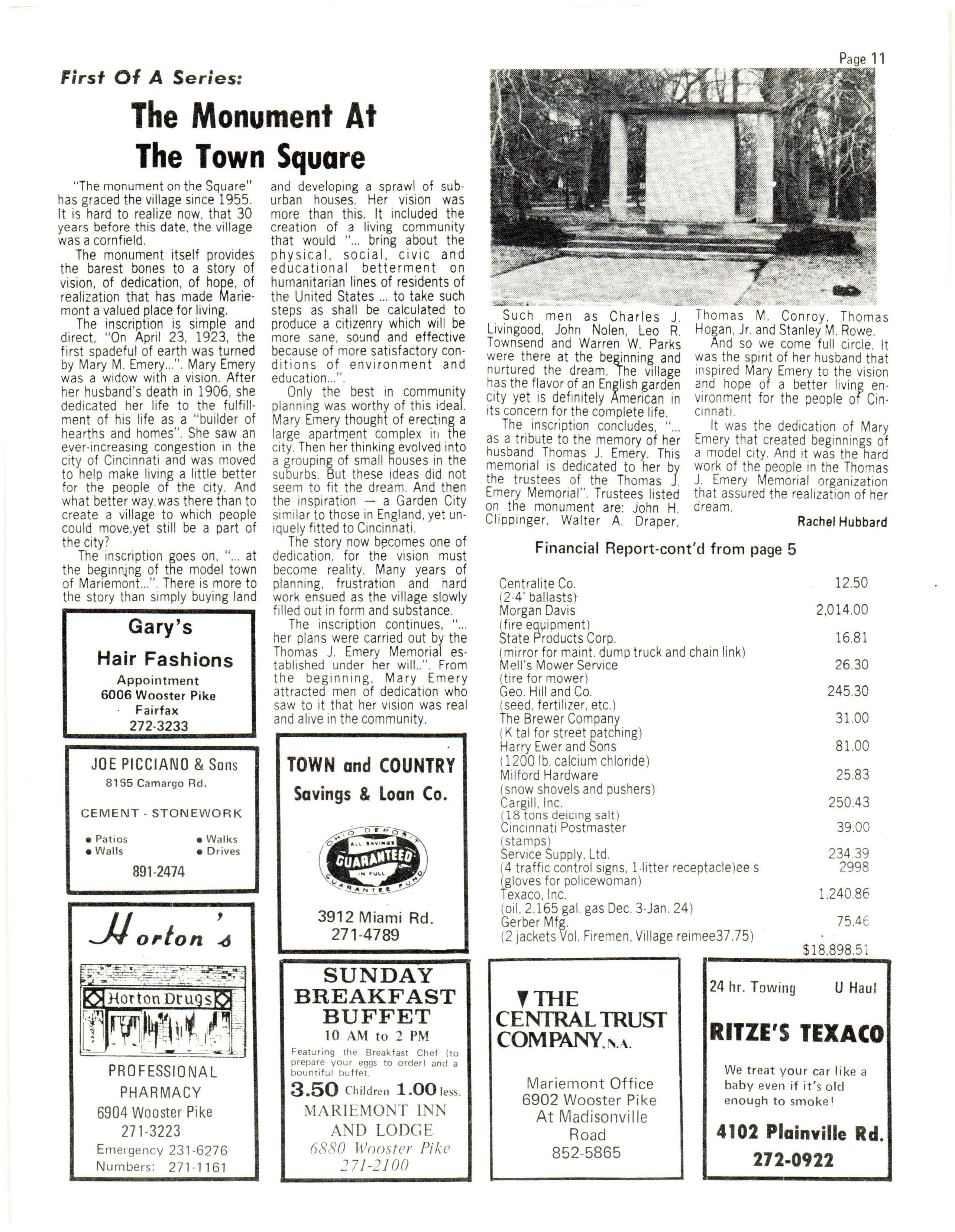 It was the dedicat ion of Mary Emer y that created beg inn ings of a mo del city And it was the hard work of the pe ople in the Tho mas J. Emer y Me mo rial organization that as sured the realization of her dream Rachel Hubba rd Financial Report-cont ' d from pa ge 5