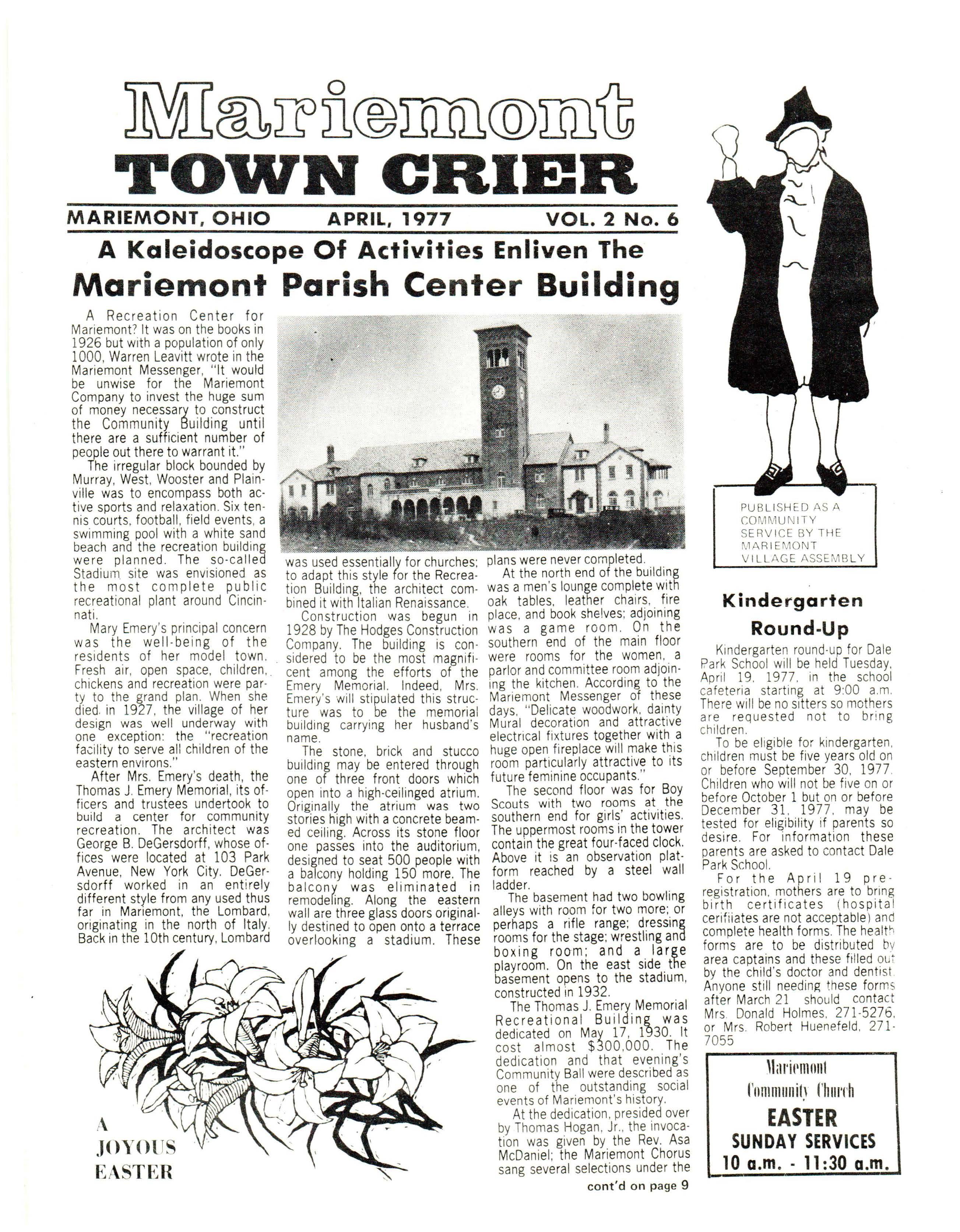 The Thomas J. Emery Memorial Recreationa l Bu ildin g was dedicated on May 17 , 1930. It cost almost $300 ,000 The dedication and that evening's Community Ball were described as one of the outstanding social events of Mariemont's history