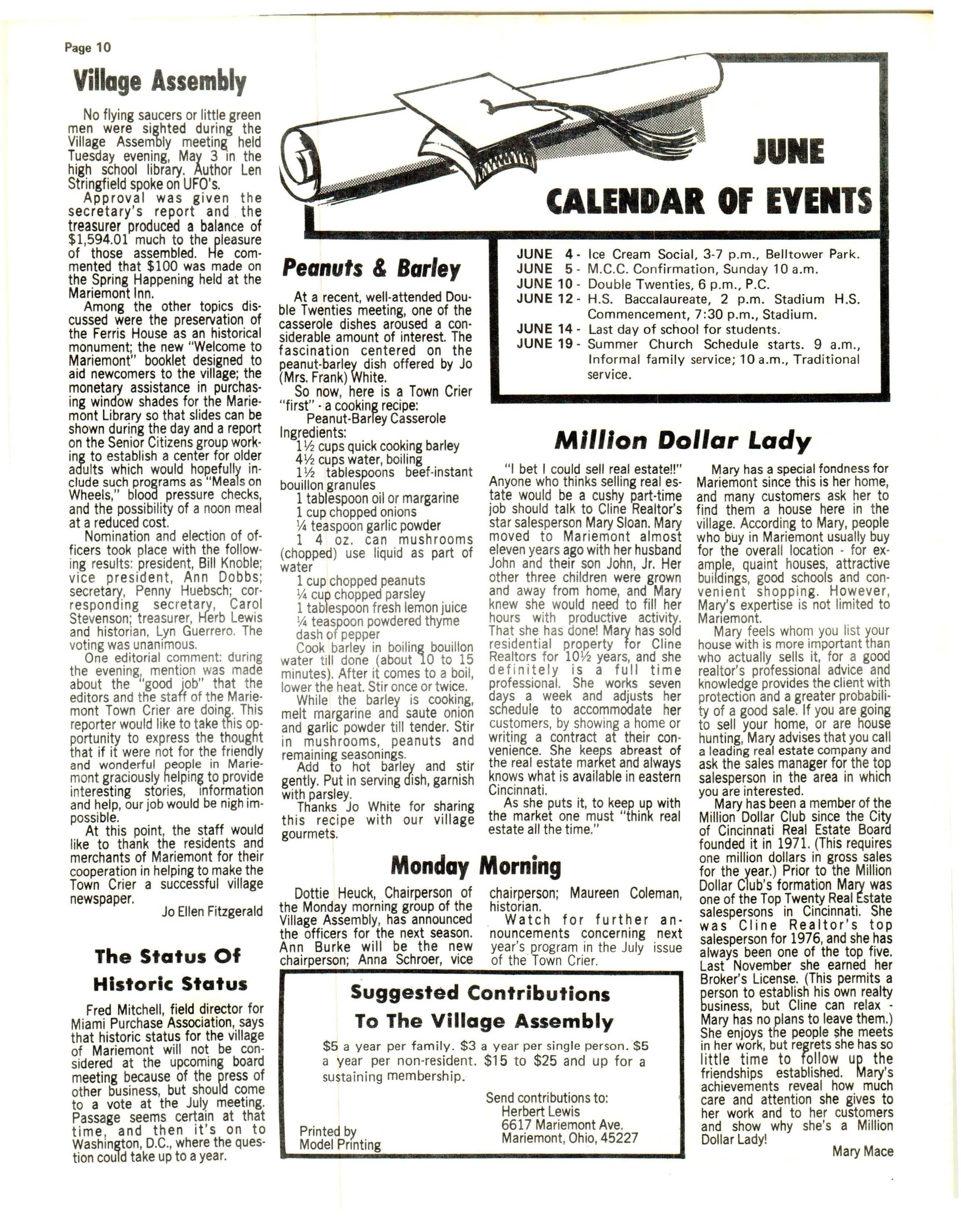Mary has been a member of the Million Dollar Club since the City of Cincinnati Real Estate Board founded it in 1971. (Thi s requires one million dollars in gross sales for the year .) Prior to the Million Dollar Club ' s formation Mary was one of the Top Twenty Real Estate salespersons in Cinc in nati. She was Cline Realtor's top salesperson for 1976, and she has always been one of the top five Last November she earned her Broker 's License (This perm its a person to establish his own realty business, but Cline can relaxMary has no plans to leave them. ) She enjoys the people she meets in her work , but regrets she has so little time to follow up the friendships established. Mary's achievements reveal how much care and attention she gives to her work and to her customers and show why she's a Million