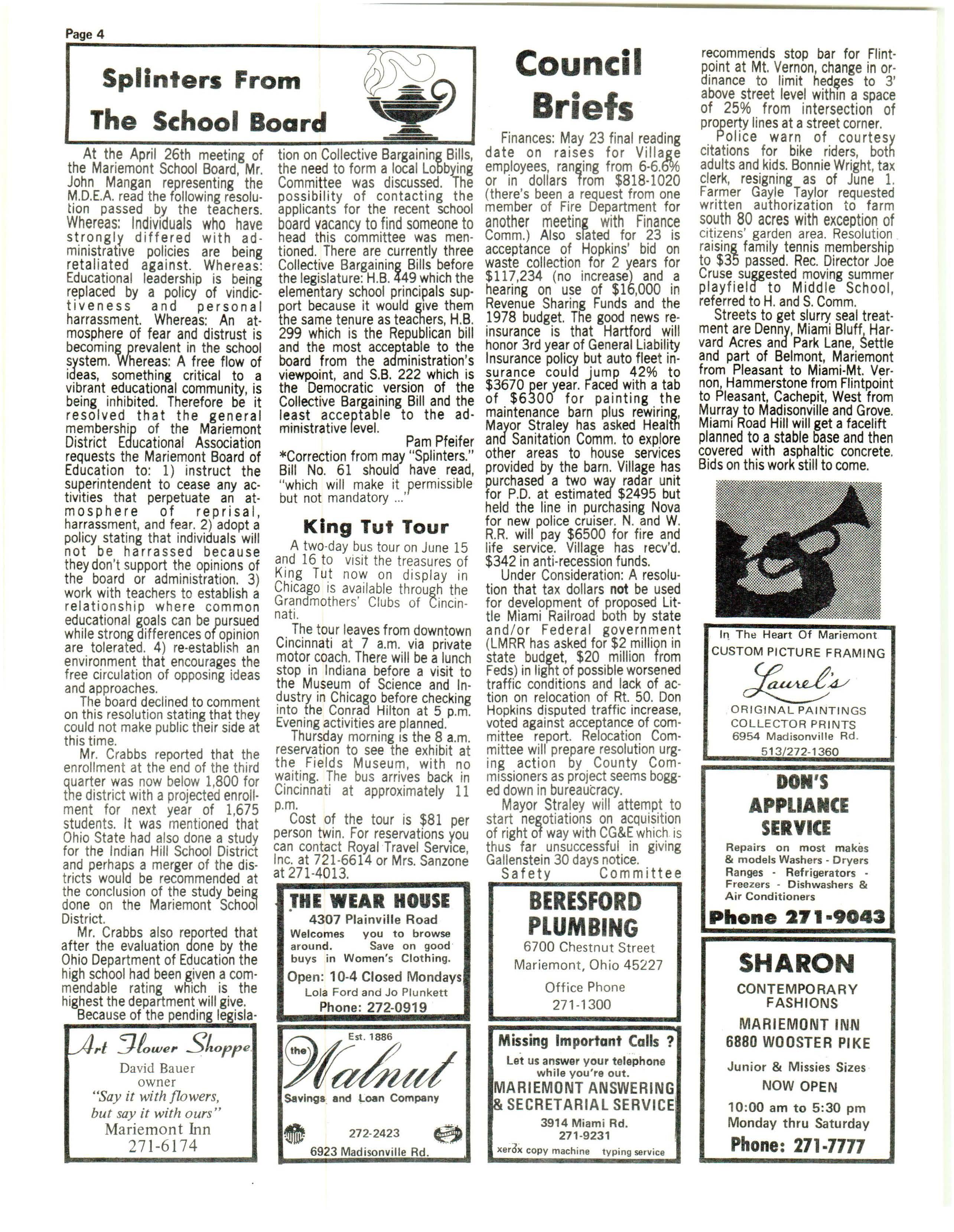 Finances: May 23 final reading date on raises for Village employees , ranging from 6-6.6% or in dollars from $818-1020 (there's been a request from one member of Fire Department for anoth er meeting with Finance Comm.) Also sfated for 23 is acce pt an ce of Hopkins' bid on waste collection for 2 years for $ 117, 23 4 (no increas e) and a hea ring on use of $16,00 0 in Revenue Sha rin g Fun ds and the 1978 budget. The good news reinsurance is that Hartford will honor 3rd ye ar of Gener al Liability In sura nce policy but auto fl ee t insur ance could jum p 42 % to $3 670 per ye ar. Fa ced with a tab of $630 0 for pa i ntin g t he maint ena nc e barn plus rew iri ng , Mayo r Stral ey has ask ed Hea lth and Sanit ation Comm . to explore oth er are as to house serv ices provid ed by the barn Village ha s purch ase d a two way radar uni t for P.D at estimated $2495 but held the line in purc hasing Nova for new pol ice cr ui ser. N. and W. R. R. wi ll pay $6500 fo r fir e and life serv ice . Vill ag e has re cv'd. $342 in anti -reces si on f unds Under Consi de rati on: A reso lut ion t hat tax dollar s not be used for deve lopment of pr oposed Lit· tie Miam i Railroad both by st ate and/o r Federal gov e rnm ent (LMR R has ask ed for $2 mi lli on in st ate bu dget, $20 milli on fr om Fe ds ) in light of po ssible worse ned traffi c condi t ions and lack of acti on on rel ocation of Rt. 50. Don Hopkins dis puted traffic in crease , vote d against acceptanc e of committee report Relocation Committee will prepare resolution urging ac t ion by County Commissioners as project seems bogged down in bureaucracy.