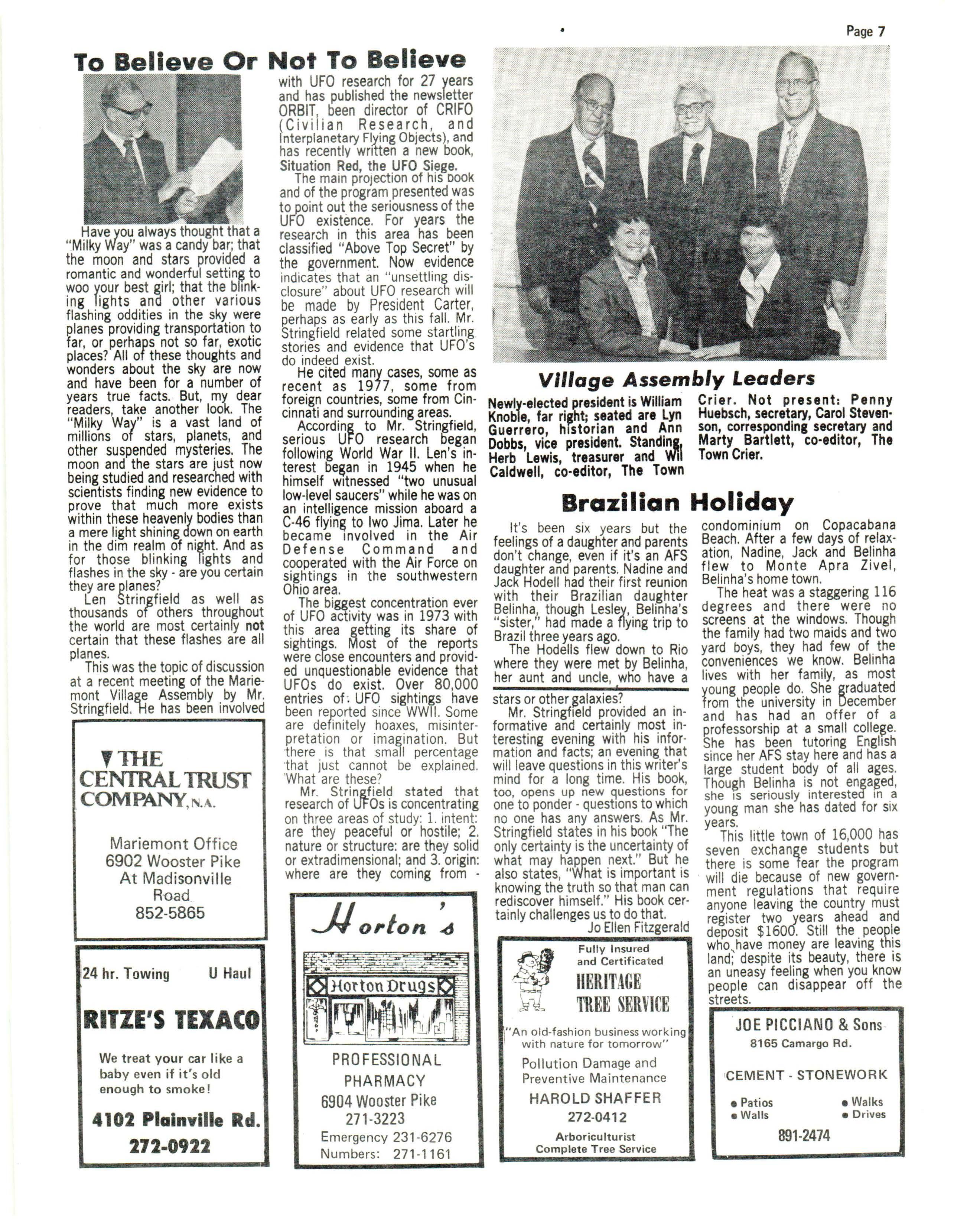 No flyin g saucers or little green men we re sighted during th e Village Assembly meeting held Tuesda y even ing , May 3 in the hi gh school library Autho r Len Strin gfield spoke on UFO's.