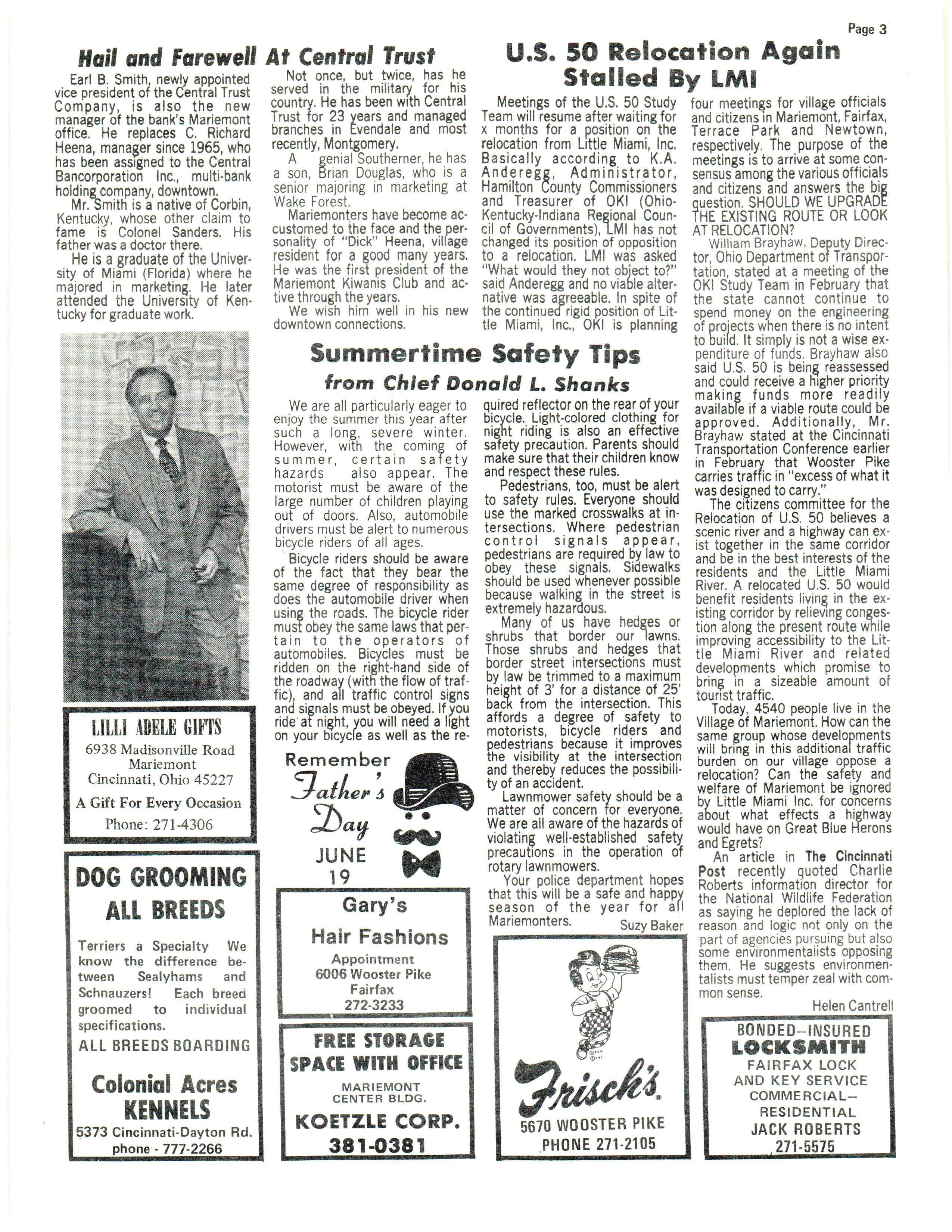Meetings of the U.S. 50 Study four meetings for village officials Team will resume after waiting for and citizens 1n Mariemont. Fairfax, x months for a position on the Terrace Park and Newtown, relocation from Little Miami, Inc. respectively The purpose of the Basically according to K.A. meetings is to arrive at some conAnd ere g g , Adm in is tr at or , sensus among the various officials Hamilton County Commissioners and citizens and answers the big and Treasurer of OKI (Ohio- question. SHOULD WE UPGRADE Kentucky-Indiana Regional Coun - THE EXISTING ROUTE OR LO OK cil of Governments), LMI has not AT RELOCATION? changed its position of opposition William Brayhaw , Deputy Directo a relocation. LMI was asked tor, Ohio Department of Transpor"Wh at would they not object to?" tation , stated at a meeting of the said Anderegg and no viable alter- OKI Study Team in February that native was agreeable. In spite of the state cannot continue to the continuea rigid position of Lit- spend money on the enginee rin g tie Miami, Inc., OKI is planning of pro/·ects when there is no intent to bui d It simply is not a wise exSum merf i me