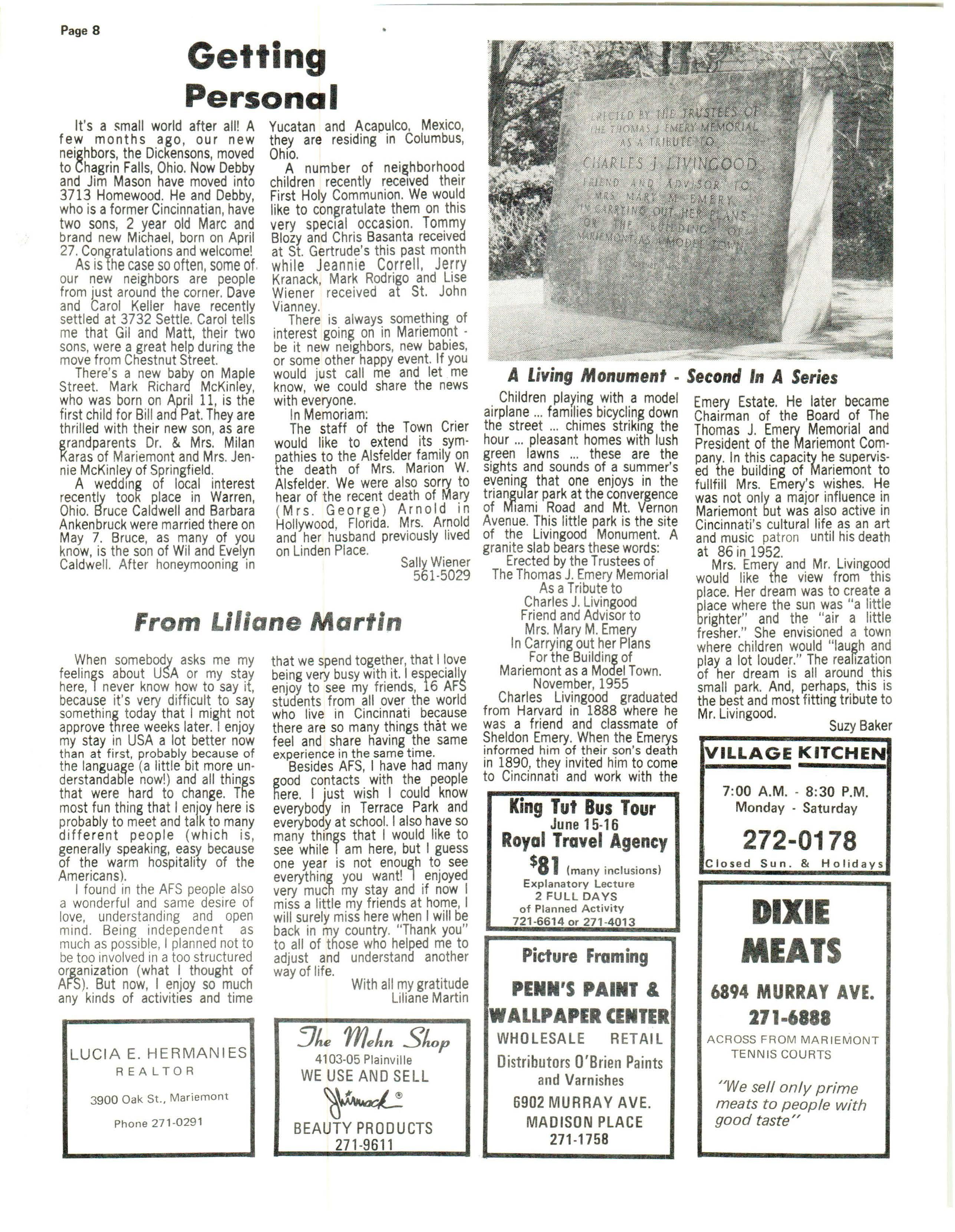 At this point , the staff wou ld lik e to thank the residents and merchants of Mariemont for their cooperation in helping to make the Town Crier a successful village newspaper