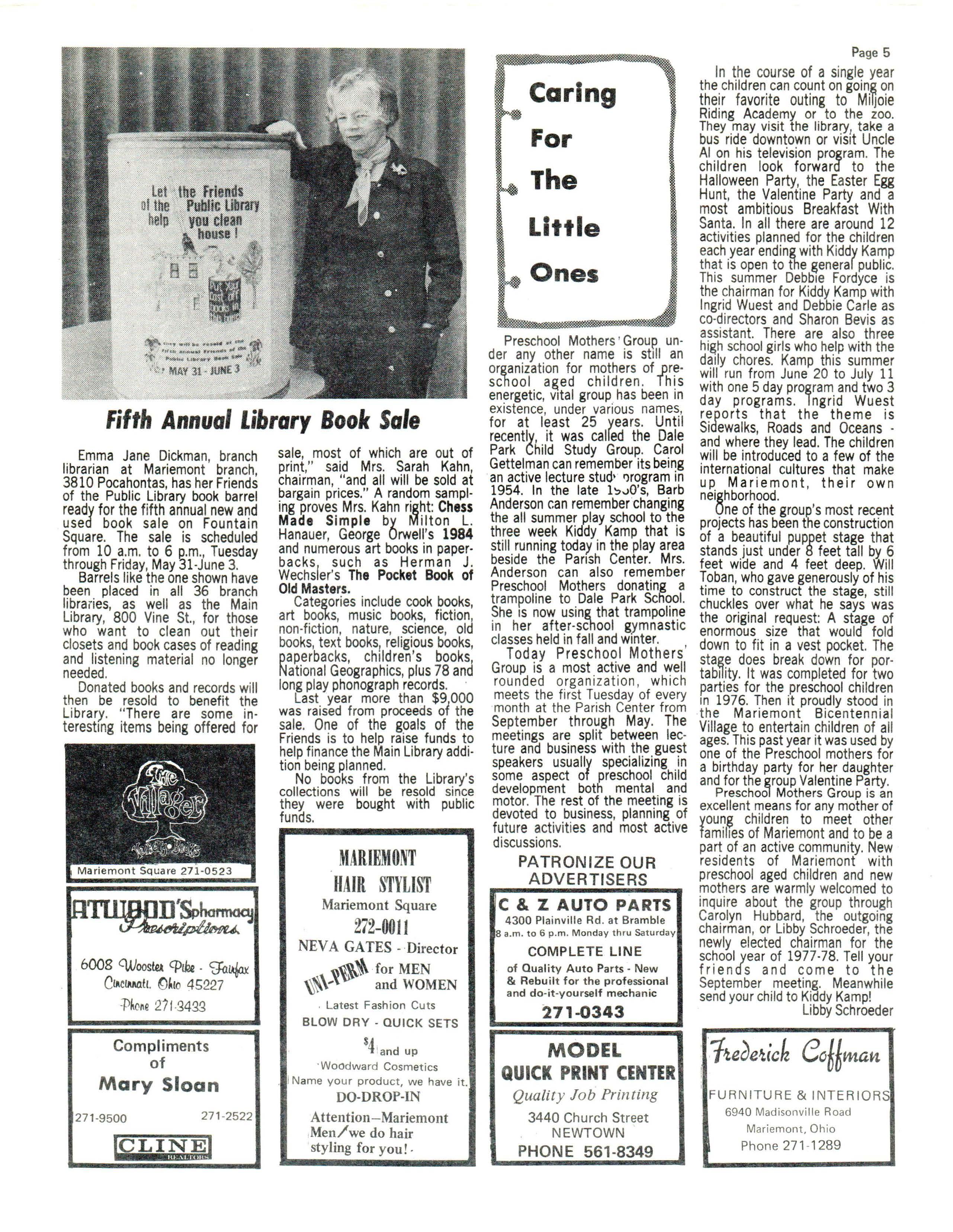 Among the other topics discussed were the preservation of the Ferris House as an historical monument; the new "Welcome to Ma ri emont" booklet designed to aid newcomers to the village; the monetary assistance in purchasing window shades for the Mariemont Library so that slides can be shown during the day and a report on the Senior Citizens group working to establish a center for older adu lts which would hopefully include such programs as "Meals on Wheels, " blood pressure checks, and the possibili ty of a noon meal at a reduced cost.