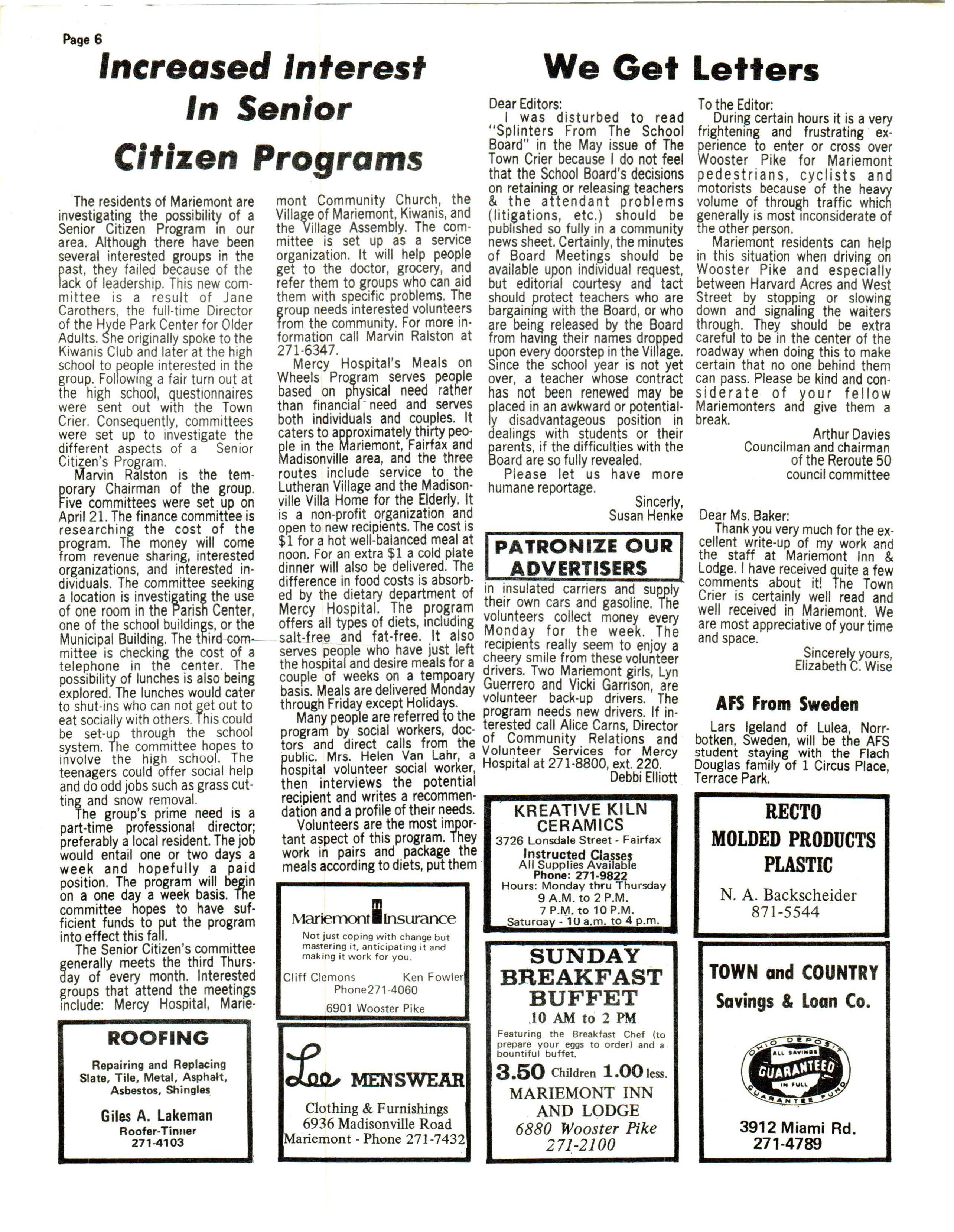 On e ed itor ial comment: during the eve ning, mention was mad e about the "g ood job" that the editors an d th e sta f f of t he Mari emont Town Cri er are doing. This reporte r would like to t ake t his opportunity to exp ress the thought th at if it were not for the fr iendly an d wonderful people in Mariemont grac iou sly he lp ing to provide interesting stor ie s, information and help, ou r job would be nigh imposs ible