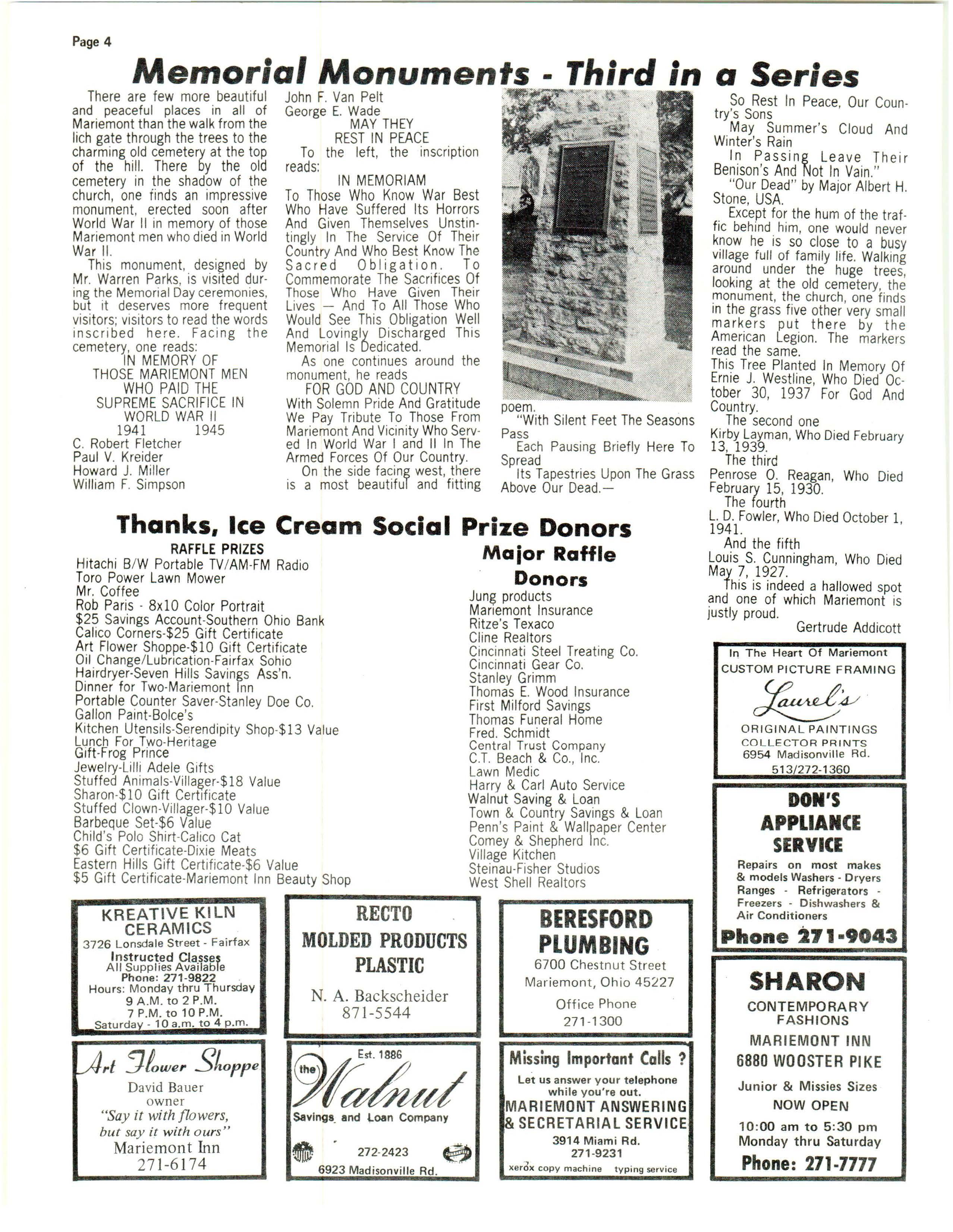 There are few more beautiful and peaceful places in all of Mariemont than the walk from the lich gate through the trees to the charming old cemetery at the top of the hill. There by the old cemetery in the shadow of t_he church, one finds an ImpressIve monument, erected soon after World War II in memory of those Mariemont men who died in World War II.