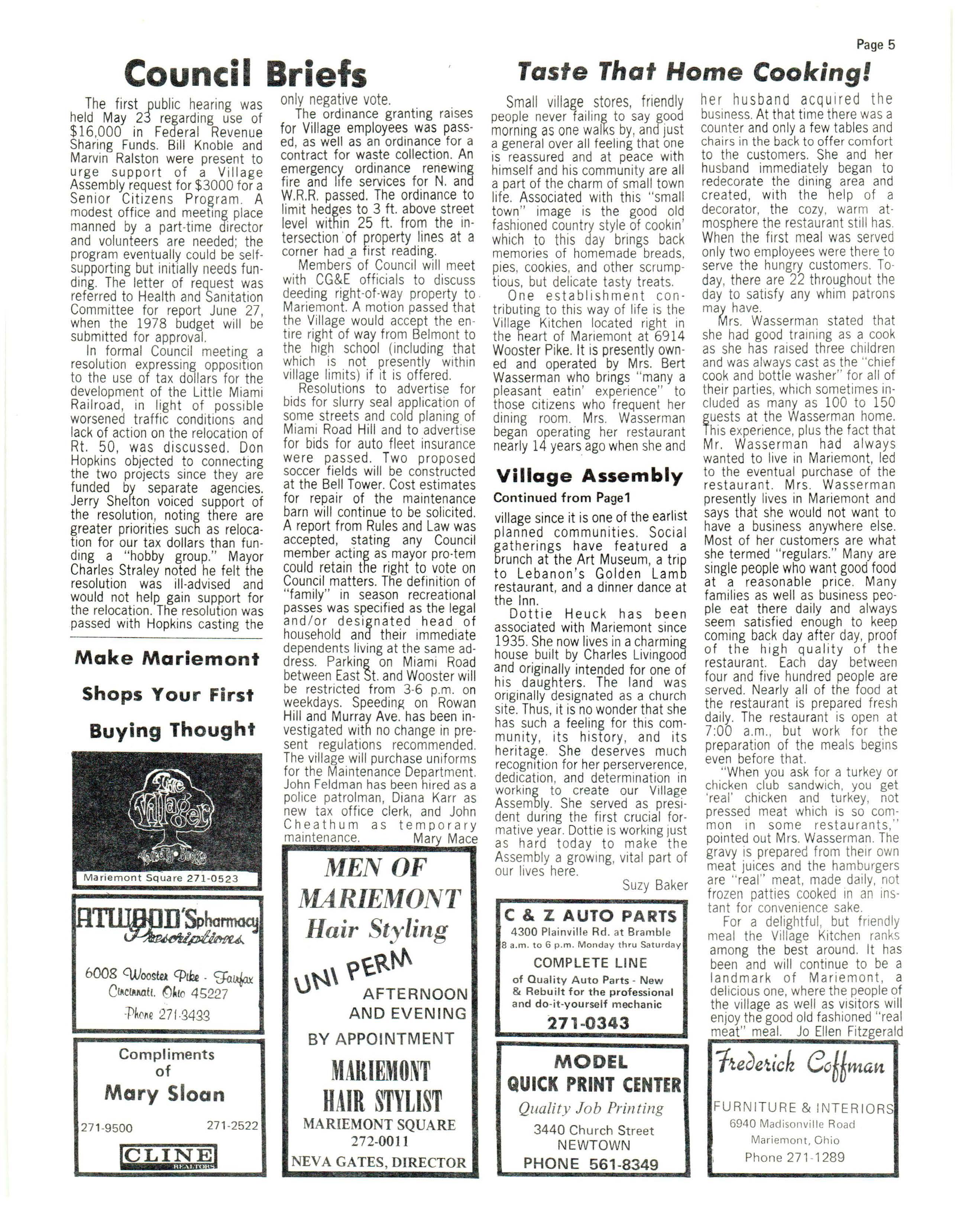 One establishment contributing to this way of life is the Vil lage Kitchen located right in the heart of Mariemont at 6914 Wooster Pik e It is presently owned and operated by Mrs. Bert Wass erman who bri ng s " many a pleasant eatin' experience" to those citizens who frequent her dining room. Mrs Wasserman began operating her restaurant near ly 14 years ago wh en she and