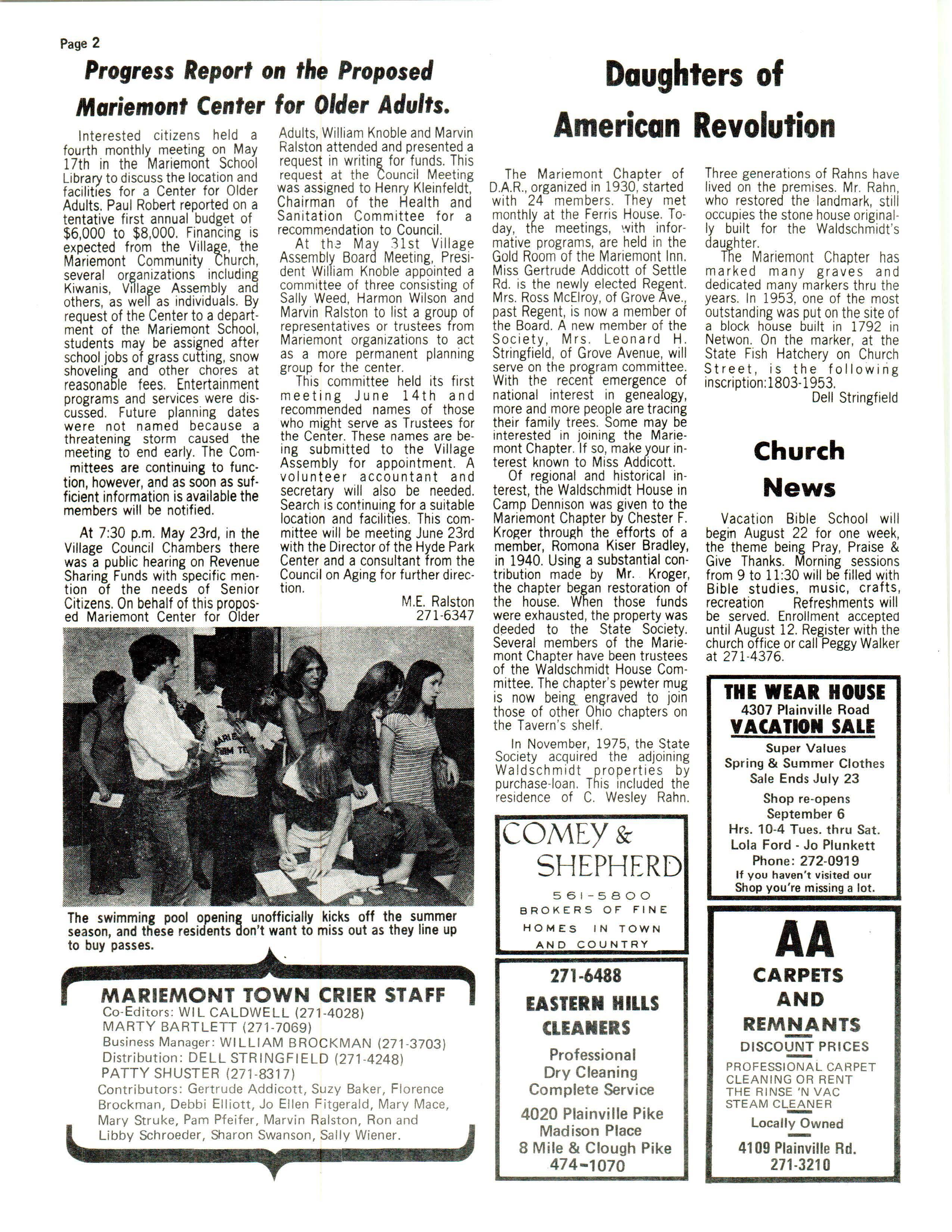 The Mar i em on t Chapte r of DAR ., organ ized in 1930, started with 24 membe rs. They met month ly at the Fe rris House Today , the meetings , 1.'vith informative pr ograms , are held in the Go ld Ro om of the Mariemont Inn . Miss Gert rude Addicott of Settle Rd. is the newly ele cted Regent. Mrs Ross McElroy , of Grove Ave ., past Reg ent, is now a member of the Board A new member of the Society , Mrs Leonard H Stringfield , of Grove Avenue, will serve on the program commit te e With the recent eme rgenc e of national interest in genealogy, mo re and more people are tracing their famil y trees Some may be in terested in joining the Mariemont Chapte r If so , make your interest known to Miss Addicott.