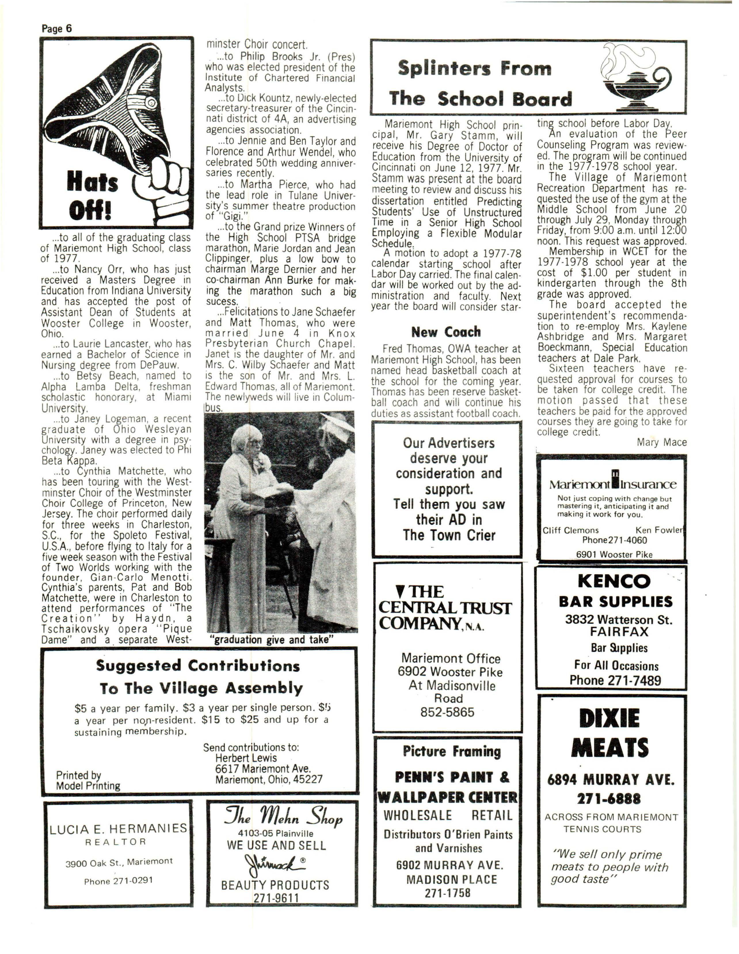 Since the close of school, duct has been reported to be dispolice reports have reflected turbing. numerous acts of vandalism, · Chief Shanks warns that trespassi ng , and disturbances without the cooperation of created by bands of juveniles parents, some action will have to roaming the community at all be taken to restrict the movement hours, as late as 5 a m. Police of these children. Chief Don Shanks wants parents School Board Elect "i ons to be aware of the problem and to know the whereabouts of their Elections for the Mariemont children. Many of these children Board of Education will be held in have _told police officers they are November, 1977 Charles Boersig, sleeping at a friend's home in Jo Lakeman, and Thomas Allman groups and for I a ck O f will be completing their terms and somethingto do, they roam the be up for re-election if they streets and get into mischief. choose to run.