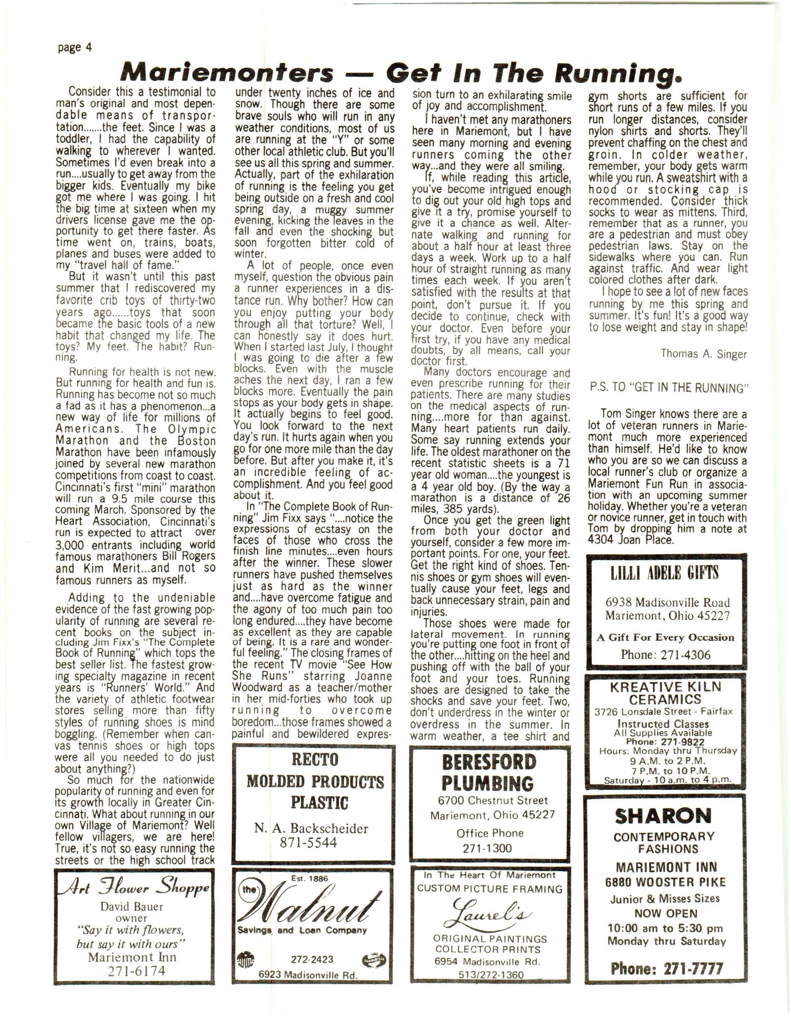 Tom Singer knows there are a lot of veteran runners in Mar iemont much more experienced than himself He'd like to know who you are so we can discuss a local runner's club or organize a Mariemont Fun Run in association with an upcoming summer holiday Wh ether you're a vetera n or nov ice runner, get in touch with Tom by dropping him a note at 4 304 Jo an Place .