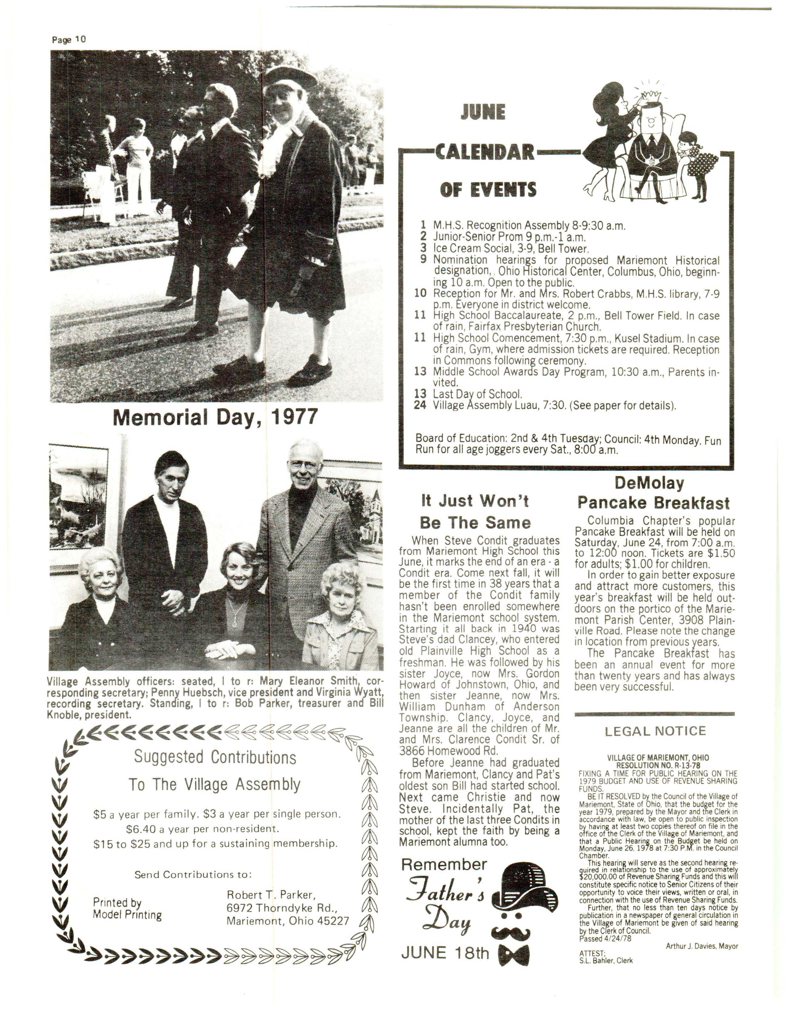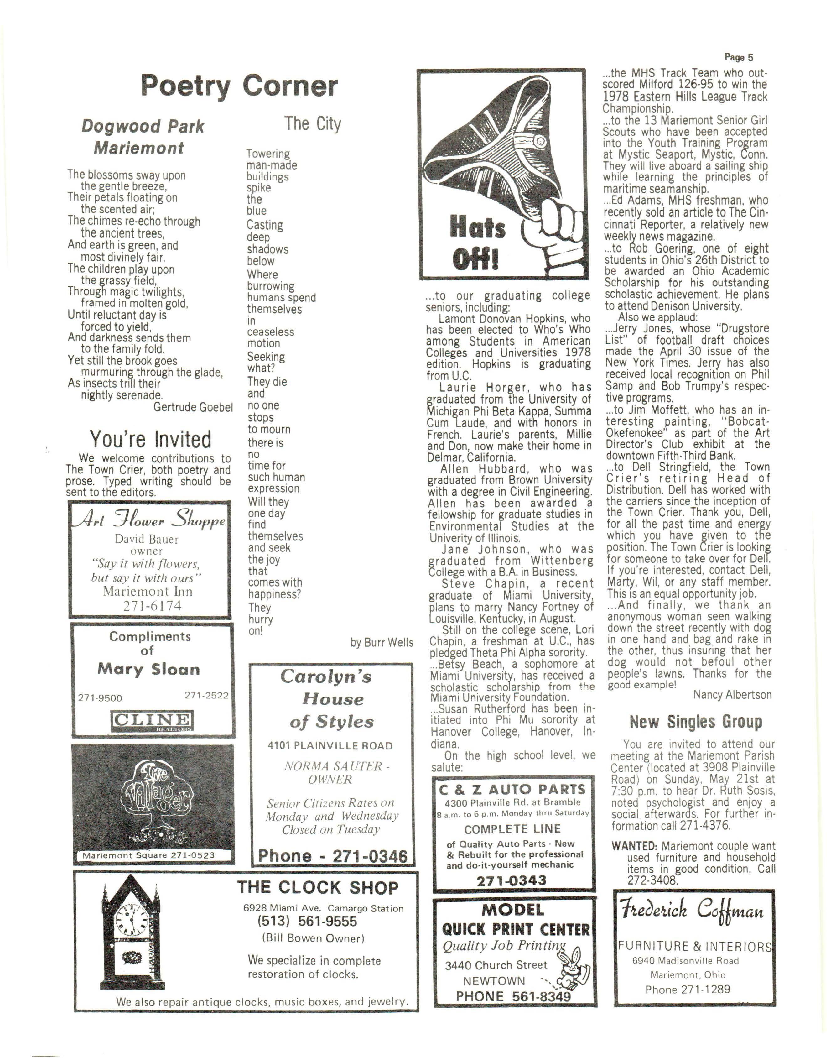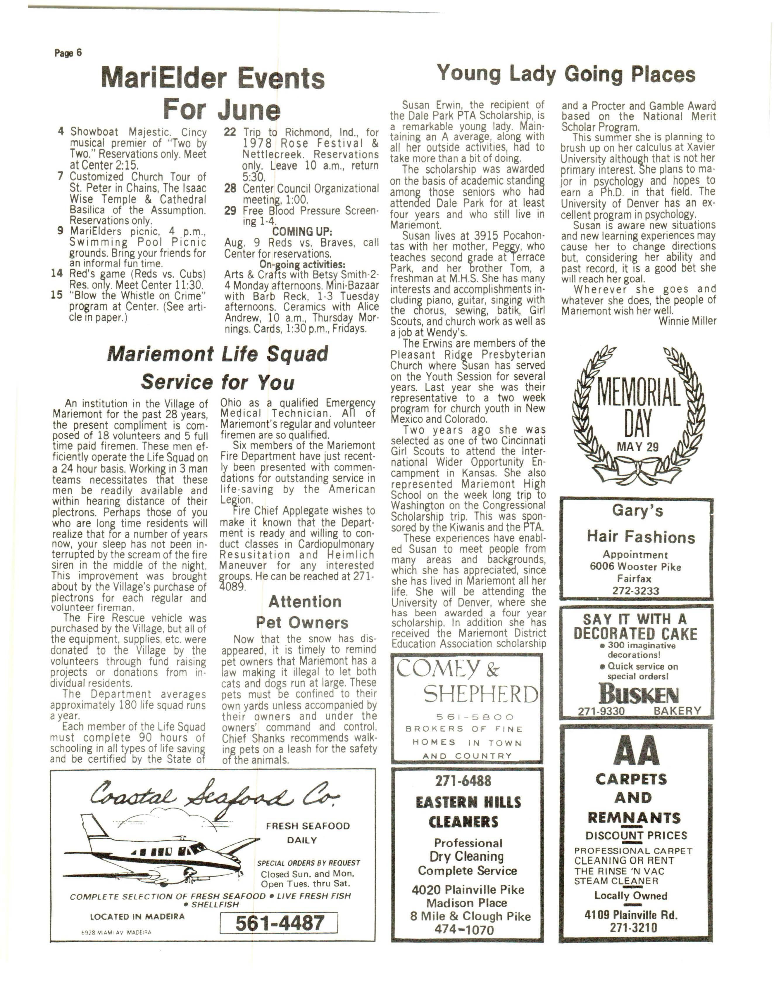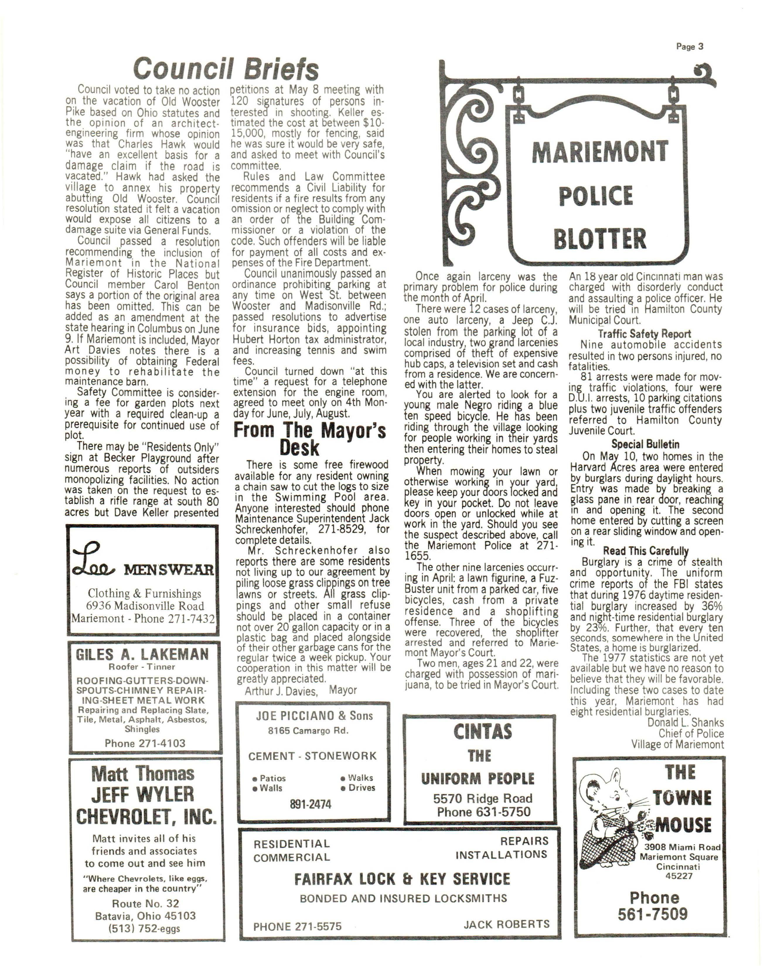 Council passed a resolution recommending the inclusion of Mariemont in the National Register of Historic Places but Council member Carol Benton says a portion of the original area has been omitt ed. This can be add ed as an amendment at the st at e hear in g in Co lum bus on June 9. If Mar iemo nt is includ ed , Mayo r Art Davies notes t here is a poss ibility of obtaining Federal money to r e h a b i l i tate t he maint enance barn . Safe ty Commit t ee is considering a f ee fo r ga rden plot s next yea r with a req uired clean -up a prerequ isite for co nti nue d use of plot.