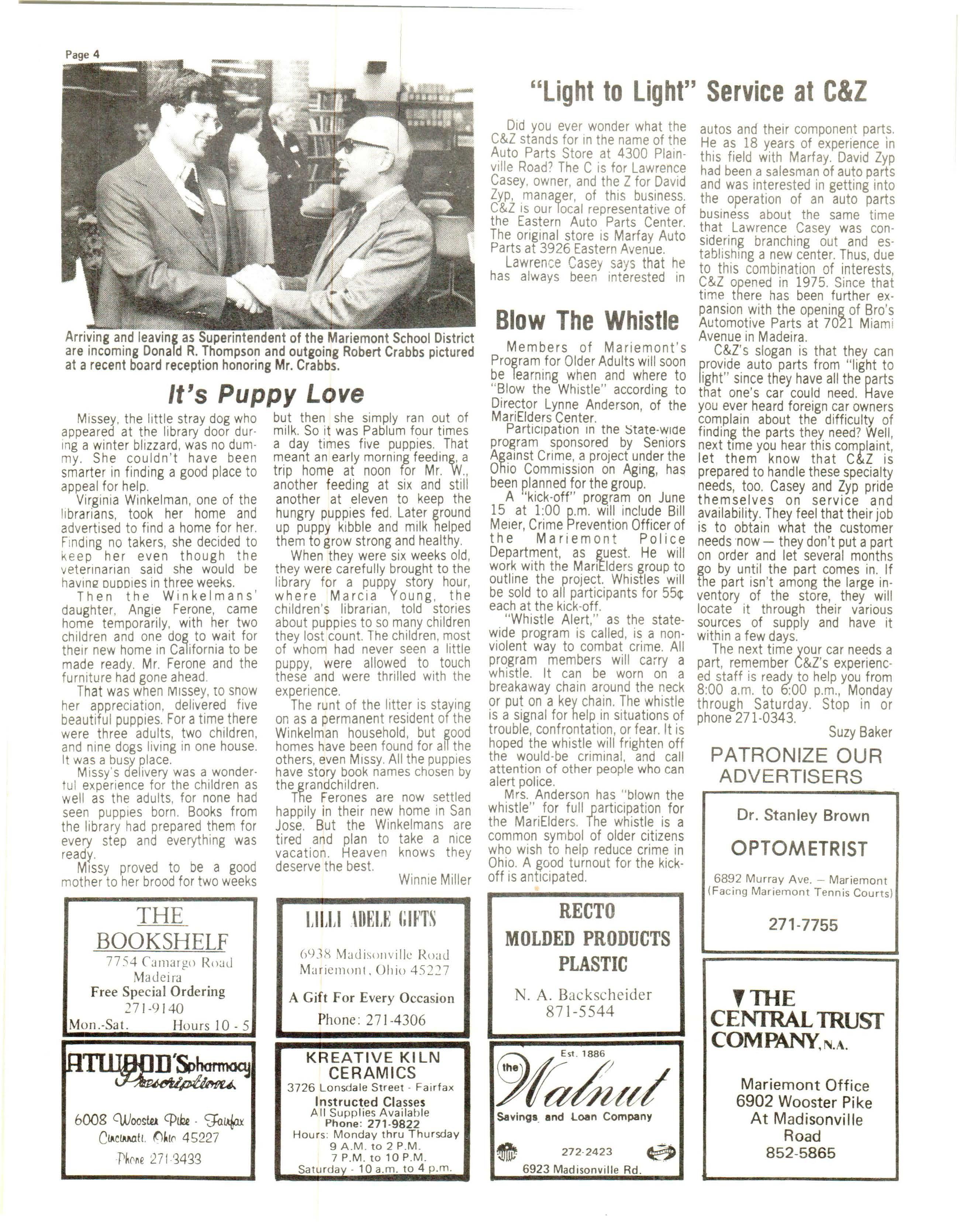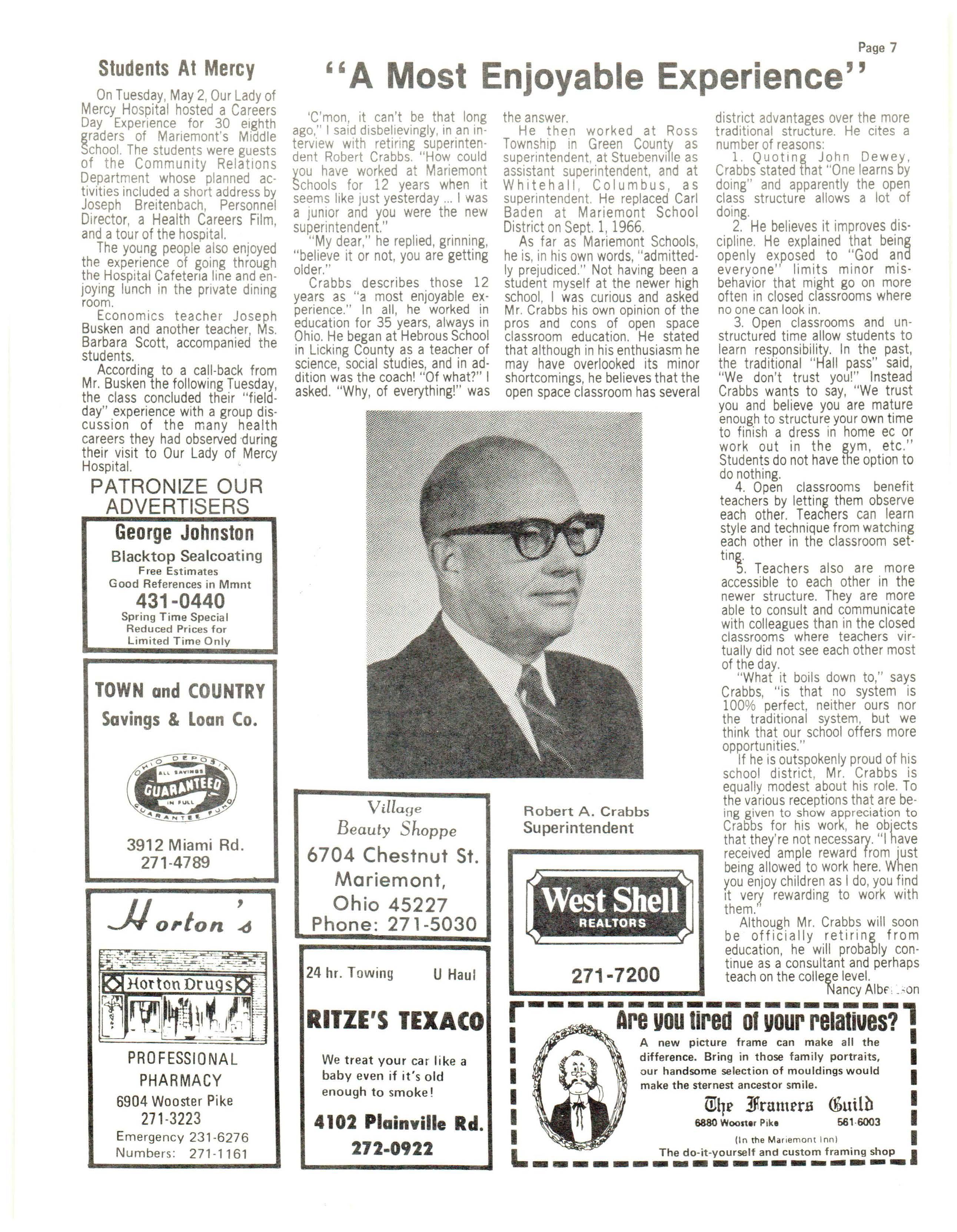 As far as Mariemont Schools, he is, in his own words, "admittedly prejudiced." Not having been a student myself at the newer high school, I was curiou s and asked Mr Crabbs his own opinion of the pros and cons of open space classroom education. He stated that although in his enthusiasm he may have overlooked its minor shortcomings, he believes that the open space classroom has several